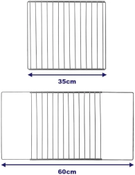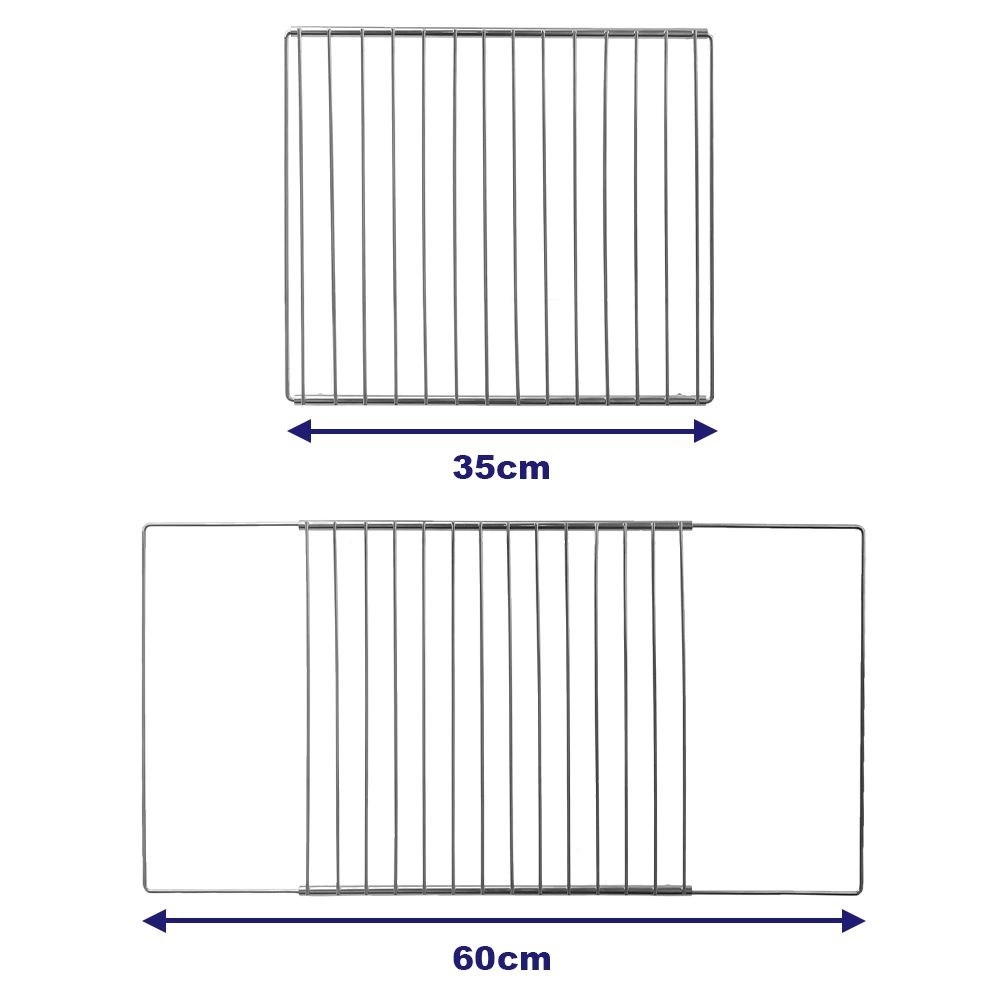La construcción extensible de 35–60 cm con fijación mediante tornillos permite adaptar con precisión la rejilla al ancho de tu horno.