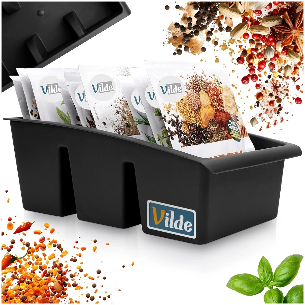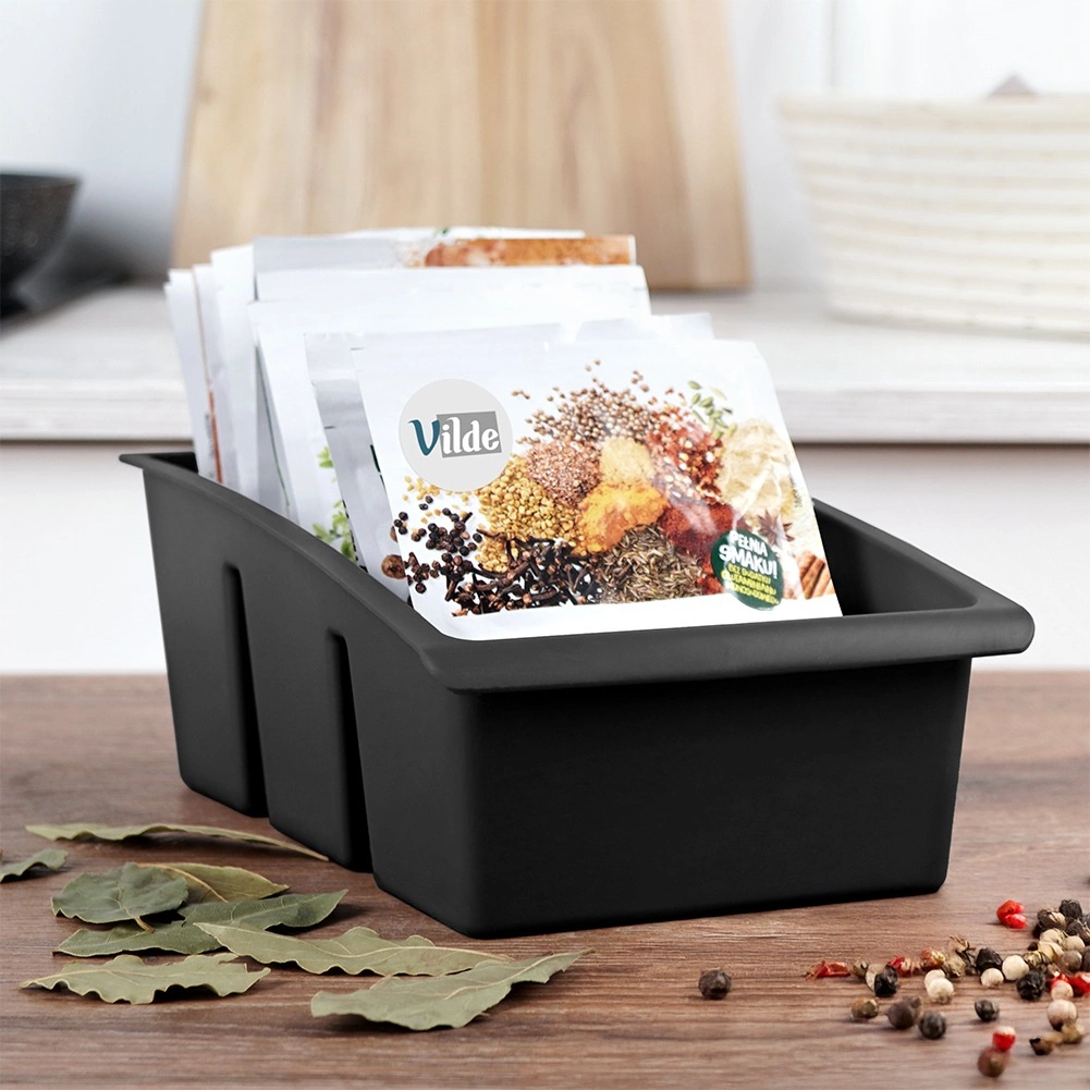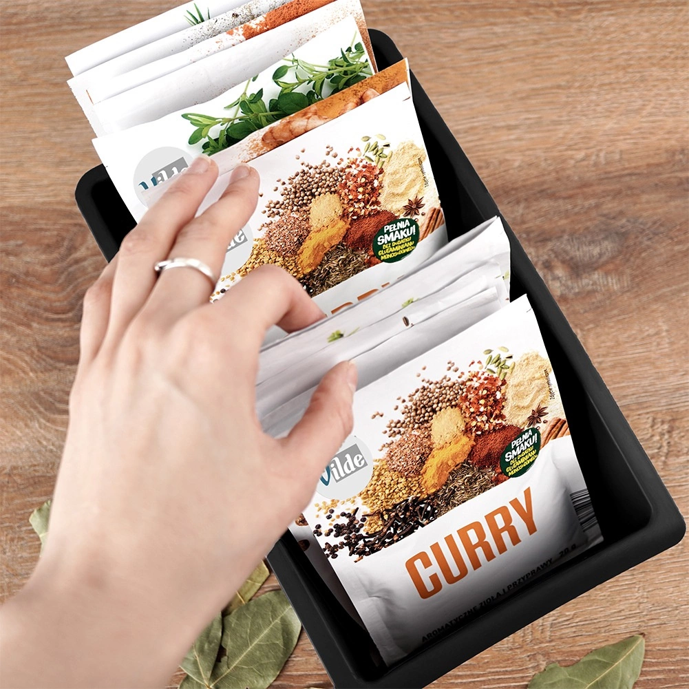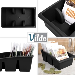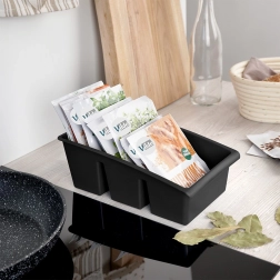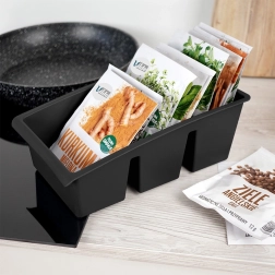 Este práctico organizador de cocina está diseñado para almacenar de forma clara los sobres de especias y hierbas. Las tres secciones separadas mantienen los sobres estables en posición vertical, para que siempre encuentres rápidamente lo que necesitas. El acabado en negro combina con cualquier cocina moderna y el material resistente se limpia con facilidad.