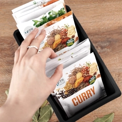 Dos separadores internos crean tres compartimentos independientes. Los sobres se mantienen en posición vertical, no se estorban entre sí y siempre podrás tomar rápidamente la especia correcta.
