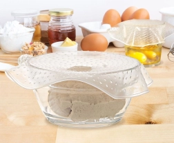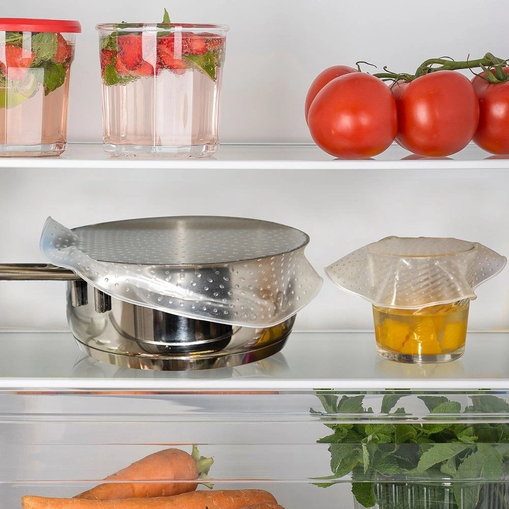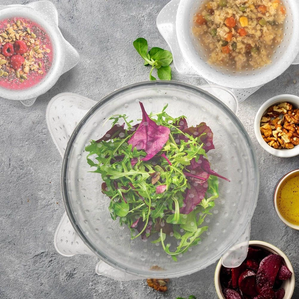 Las tapas sustituyen al film alimentario y al papel de aluminio desechables: son ecológicas, reutilizables y fáciles de lavar. Son adecuadas para vidrio, cerámica, porcelana e inox. Además de cubrir recipientes, pueden usarse como bases antideslizantes para cuencos, platos o vasos. Enrolladas ocupan un mínimo de espacio.
