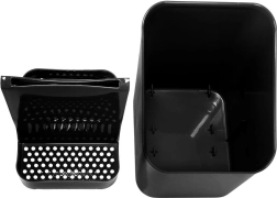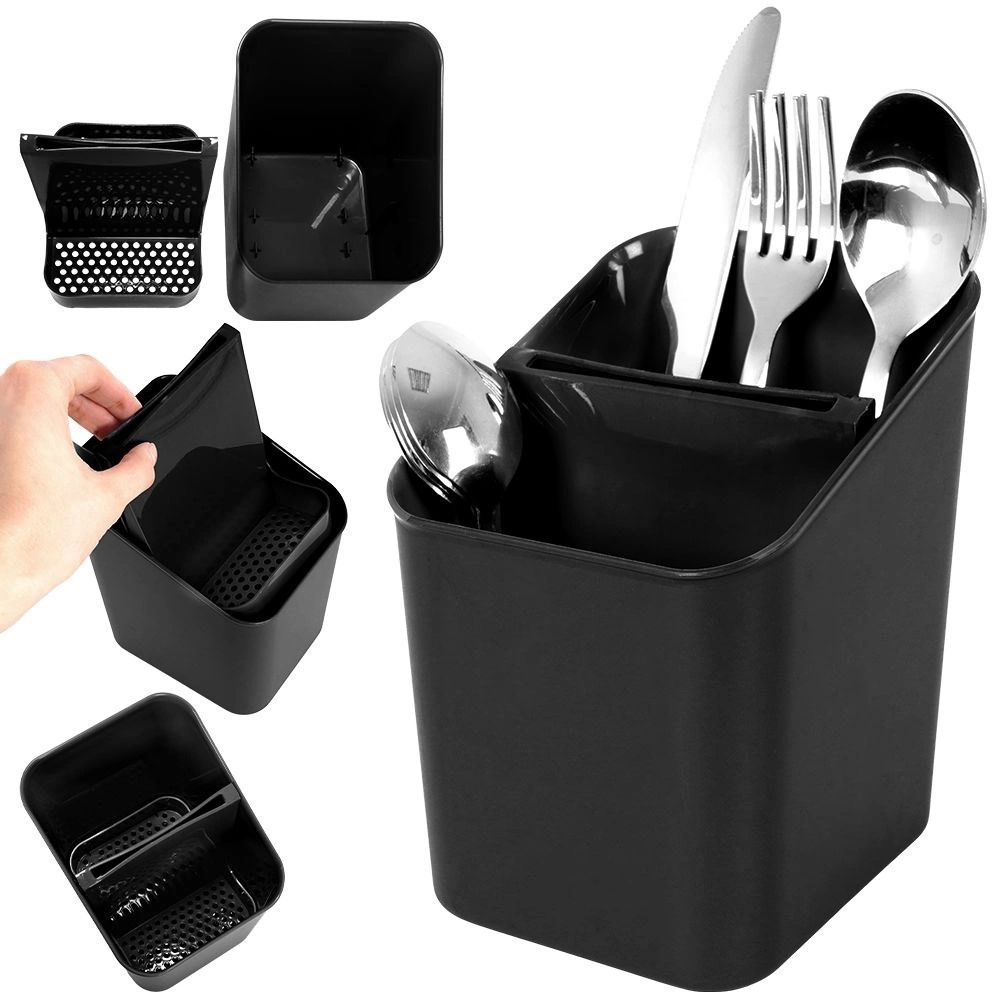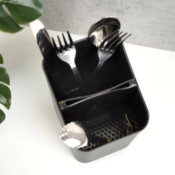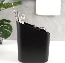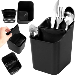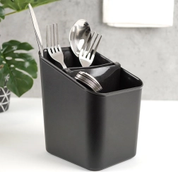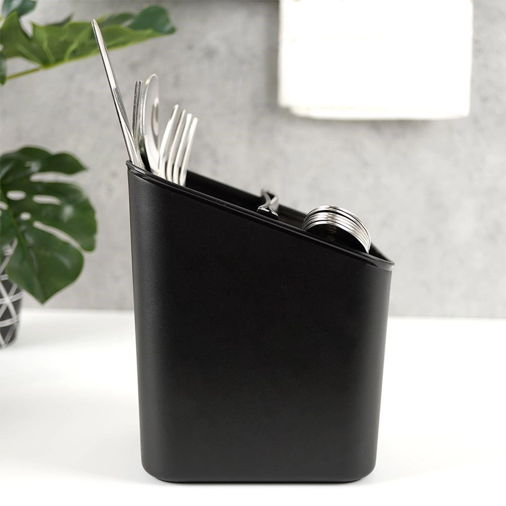 Elegante y funcional, este escurridor de cubiertos en atemporal color negro mantiene tu cocina ordenada y limpia. Gracias al separador extraíble podrás clasificar fácilmente los cubiertos y, al retirarlo, obtendrás un recipiente espacioso de una sola cámara. El fondo perforado permite un rápido drenaje del agua, evitando la humedad en los cubiertos y manteniendo seca la superficie de trabajo.