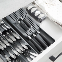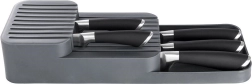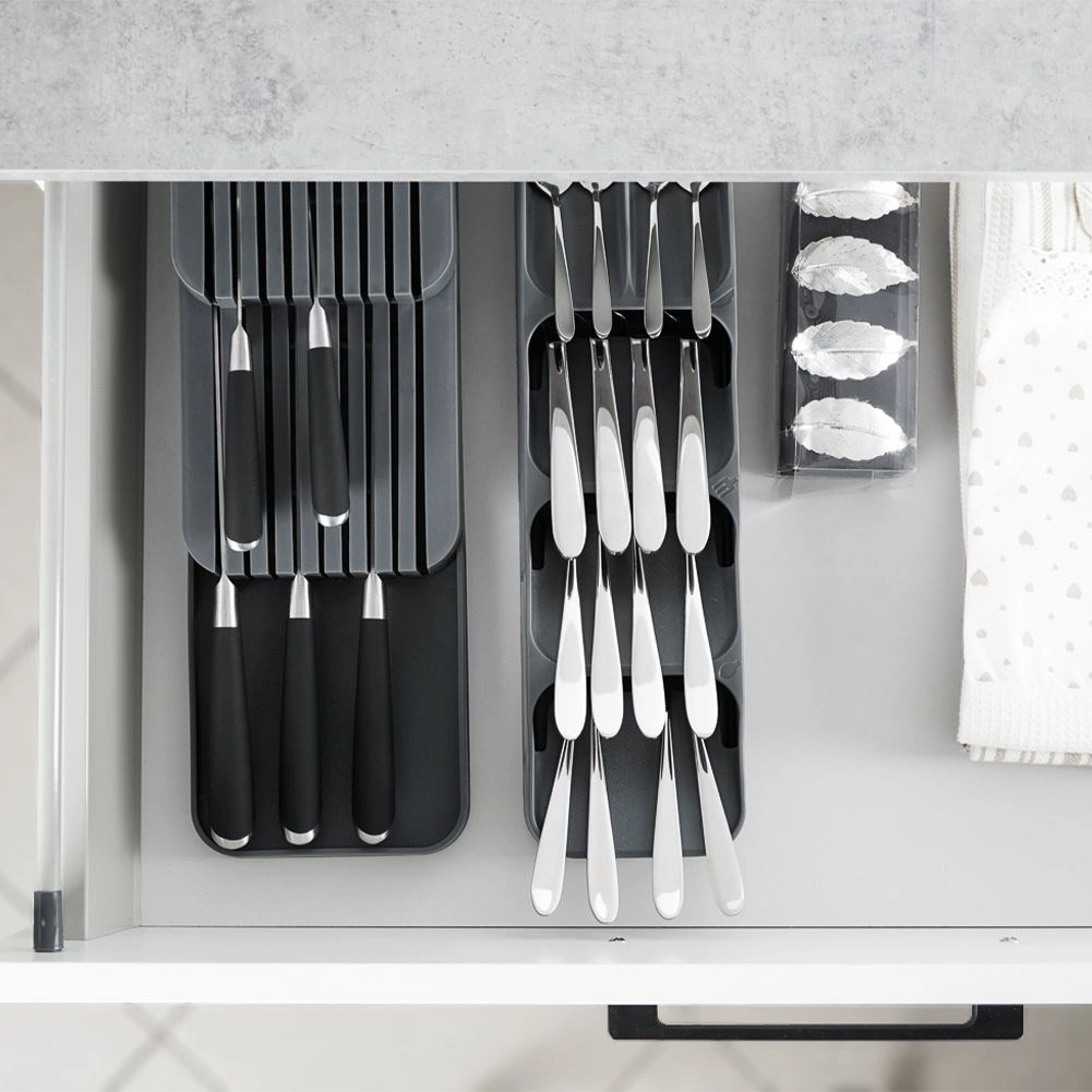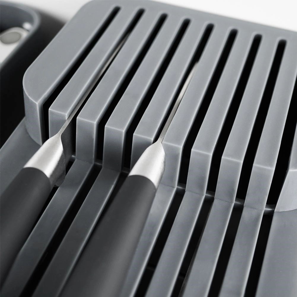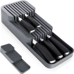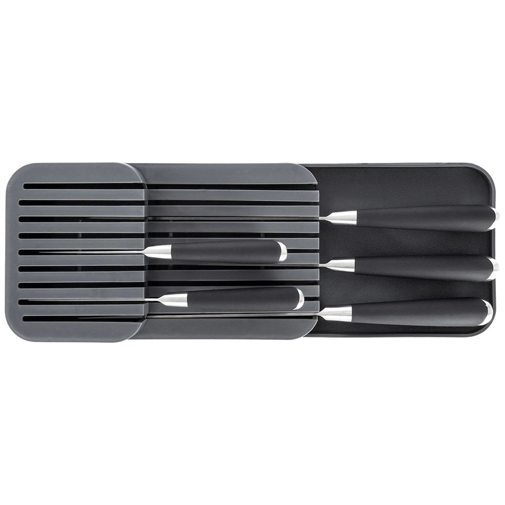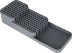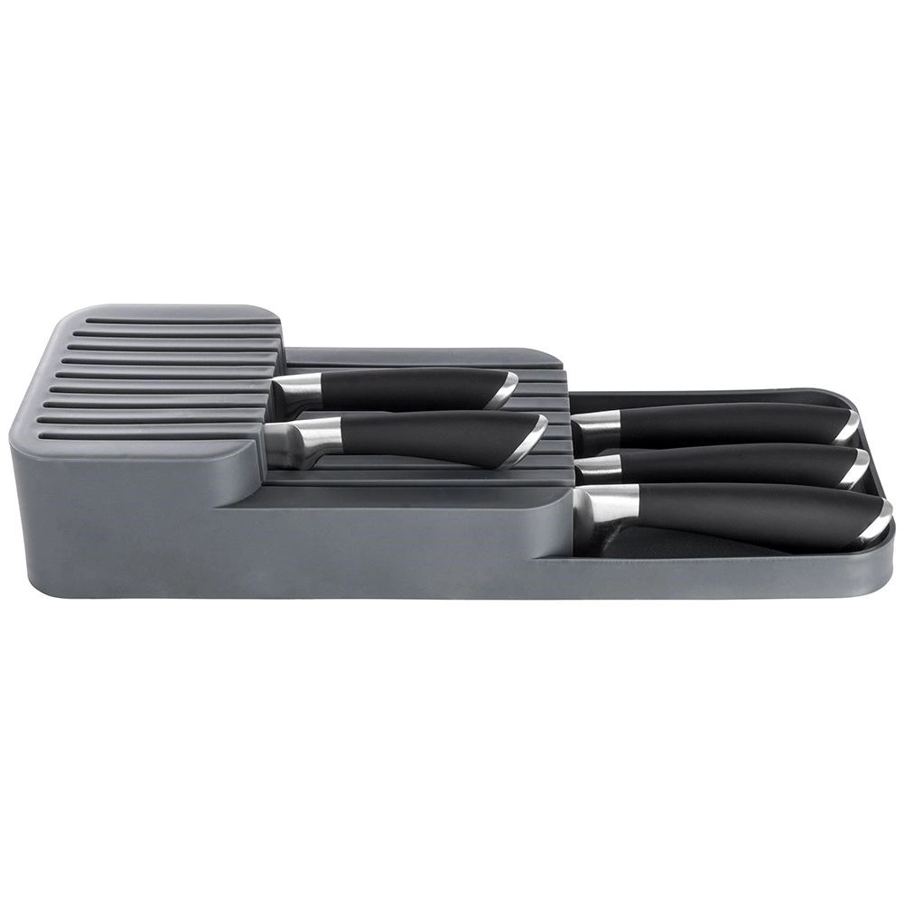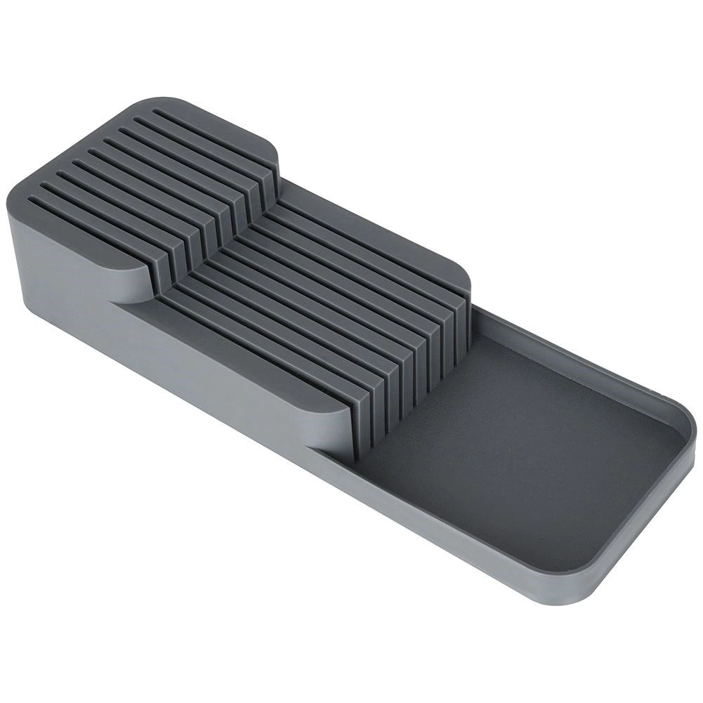 Este práctico organizador de cuchillos de plástico resistente mantiene tu menaje de cocina ordenado y seguro. Gracias a su diseño bien pensado, los cuchillos se guardan en dos niveles, ocupando el mínimo espacio y permaneciendo a la vez fácilmente accesibles. El color gris y el diseño limpio encajan a la perfección en cualquier cocina moderna.