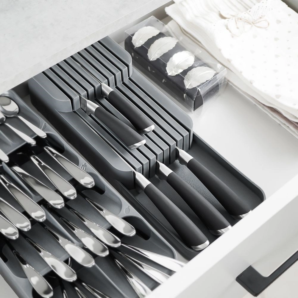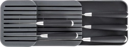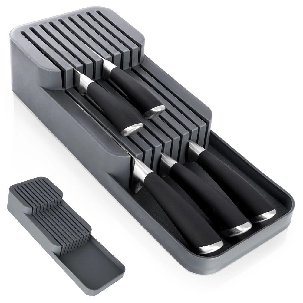 La estructura escalonada y de varios pisos permite guardar más cuchillos en menos espacio y mantener el orden en el cajón.