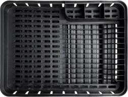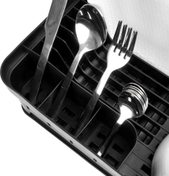 La distribución bien pensada ofrece espacio para platos, tazas y cubiertos. Tres compartimentos separados para cubiertos aceleran el secado y la organización, las ranuras para platos mantienen la vajilla estable en posición vertical y la bandeja de drenaje se extrae y limpia con facilidad. El escurreplatos es ideal para el uso diario y, gracias a sus dimensiones compactas, cabe incluso en encimeras más pequeñas.