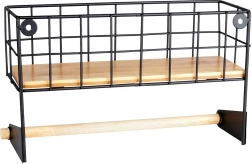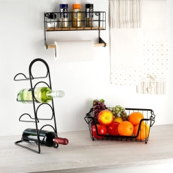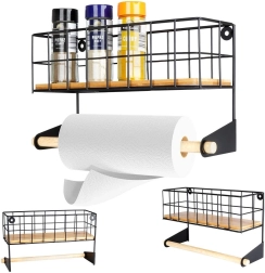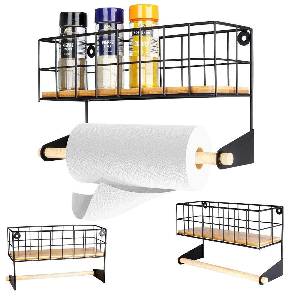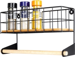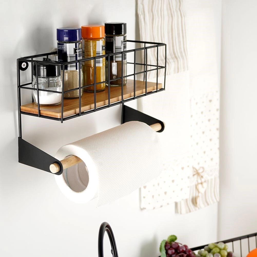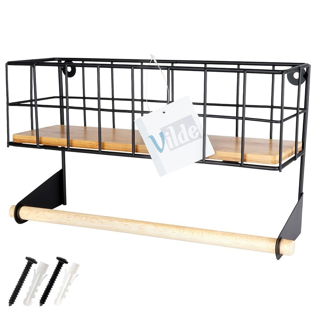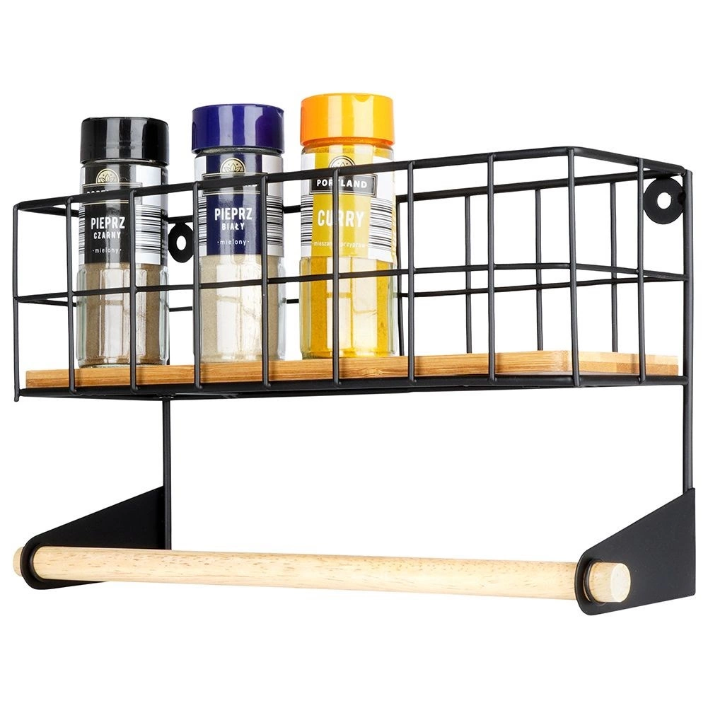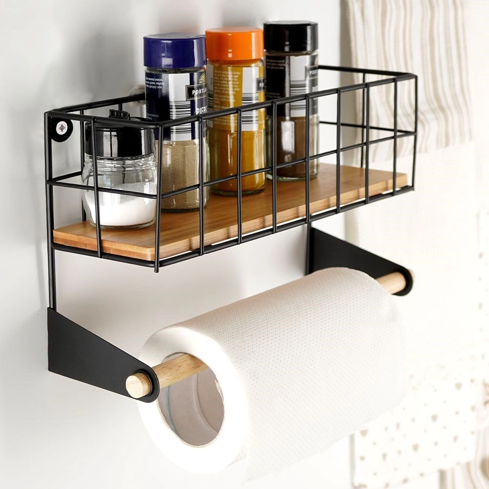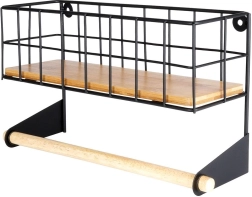 Este estante de pared con soporte integrado para toallas de papel ayuda a organizar la cocina de forma inteligente. La cesta superior aloja botes de especias o pequeños frascos, y la barra de madera inferior permite desenrollar las toallas cómodamente. La resistente fabricación en metal negro con recubrimiento en polvo y los detalles de bambú aportan un look industrial moderno.