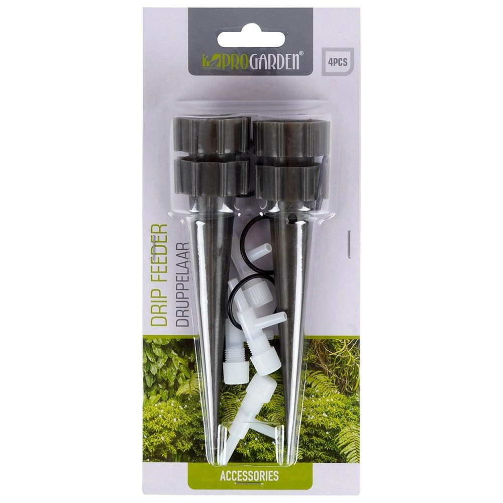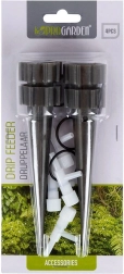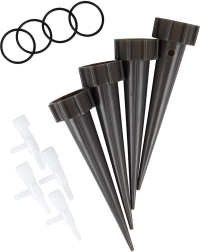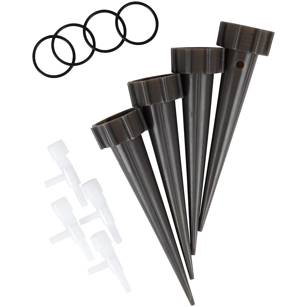 Cada pica se instala fácilmente: simplemente clávála en el sustrato junto a la planta y coloca la botella invertida. Con la válvula ajusta con precisión el caudal según el tamaño de la planta y sus necesidades de riego. El juego de 4 unidades es ideal para el hogar, el balcón, la terraza y el jardín.