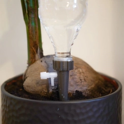 Solo hay que enroscar en una botella PET, invertirla y clavarla en el sustrato. Sin herramientas, sin pilas, listo para usar al instante.
