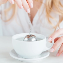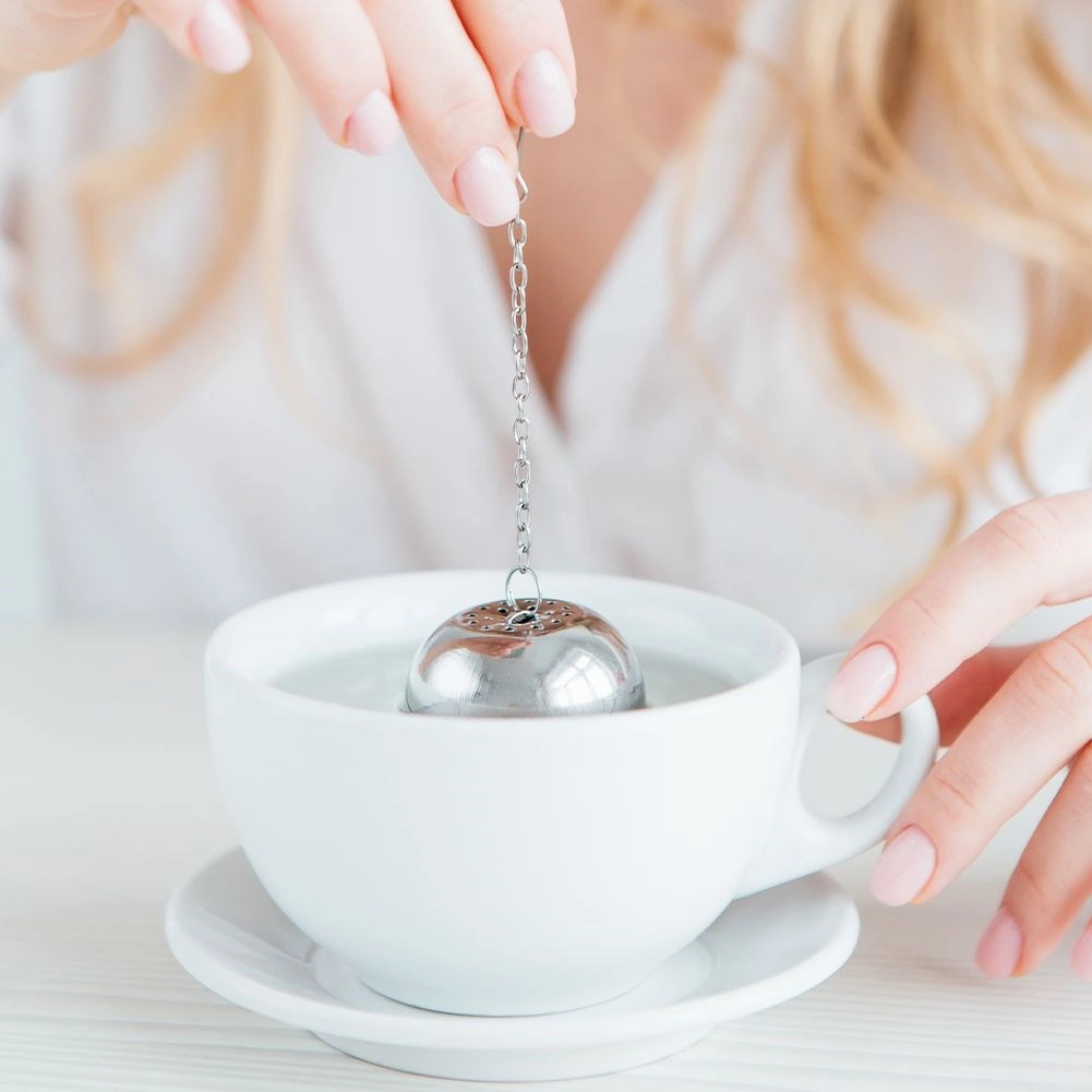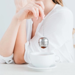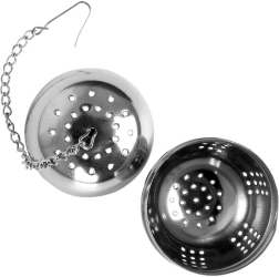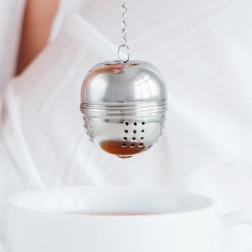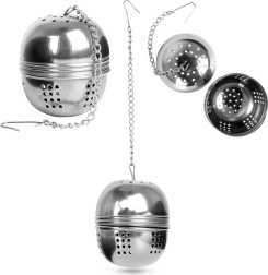 El colador tiene una forma esférica compacta y un cierre a presión seguro que evita aperturas accidentales. La cadena con gancho facilita la manipulación y el colgado en una taza, vaso o tetera. También es útil en la cocina, para hierbas y especias en sopas o caldos.