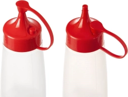Práctica botella dosificadora de 340 ml para servir con precisión salsas, kétchup, mostaza u aceite. Gracias al cuerpo semitransparente, siempre tendrás control del contenido; las paredes blandas permiten un fácil prensado y la tapa roja con cierre garantiza un sellado seguro sin goteos. Ideal para cocinas domésticas y profesionales, también para el decorado de postres con glaseado o chocolate.