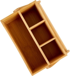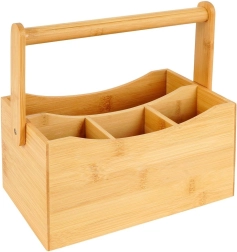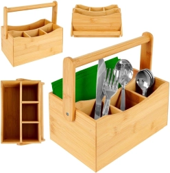 Este versátil organizador de madera es un gran ayudante para la organización y el servicio en el hogar y en la hostelería. Sus cuatro compartimentos —tres pequeños y uno grande— alojan cubiertos, servilletas, condimentos, salsas y pequeños utensilios de cocina. El asa robusta garantiza un transporte seguro y cómodo de la cocina a la terraza o al jardín.