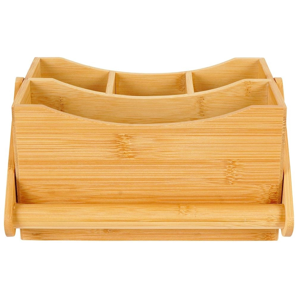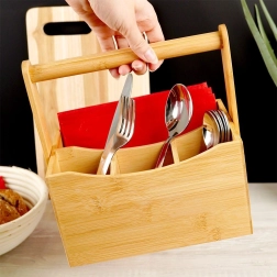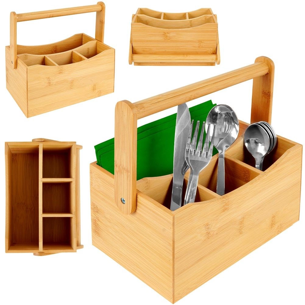 El organizador está fabricado en madera de bambú, que destaca por su resistencia natural, bajo peso y aspecto elegante. Es apto para la mesa del hogar, restaurantes, bistrós y servicios de catering, donde facilita el servicio de salsas, especias y cubiertos.
