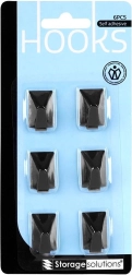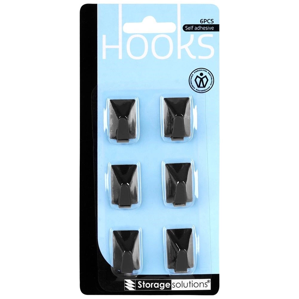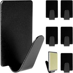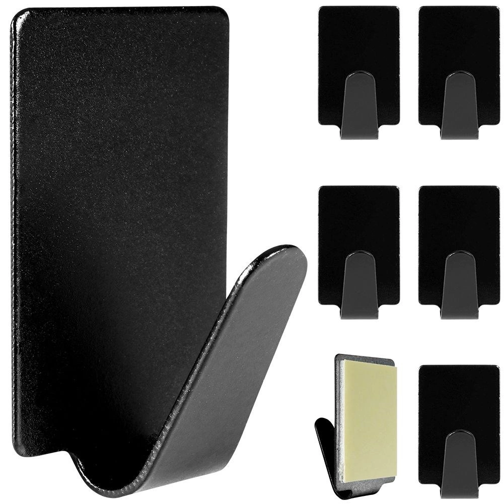 Ganchos adhesivos elegantes y prácticos en acabado negro mate para la organización diaria en la cocina y el baño. El juego de 6 piezas de acero inoxidable ofrece montaje fácil sin taladrar, sujeción firme y uso universal para toallas, paños, llaves o cables.