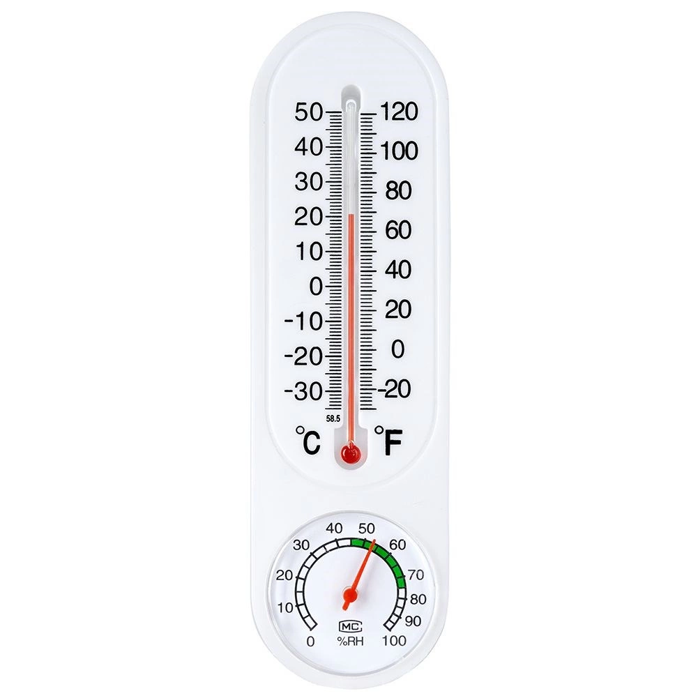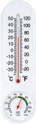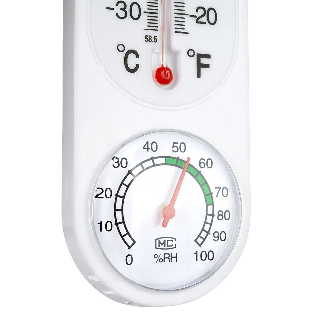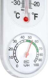 Este termómetro con higrómetro combinado te permite controlar la temperatura ambiente y la humedad relativa en tiempo real. La columna vertical de líquido muestra la temperatura en °C y °F, mientras que la esfera circular inferior indica la humedad en el rango 0–100 % HR con una zona de confort para una rápida orientación.
