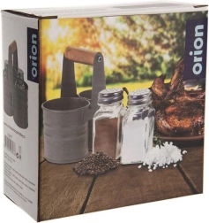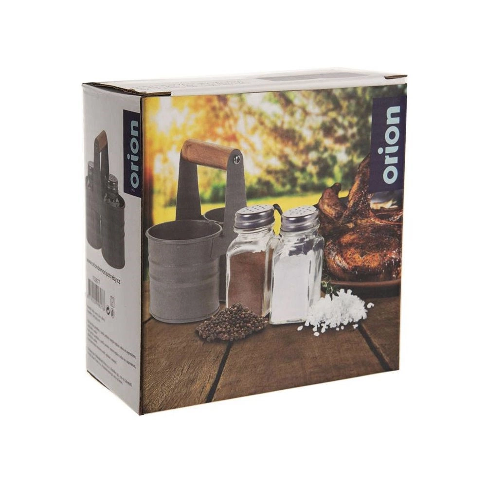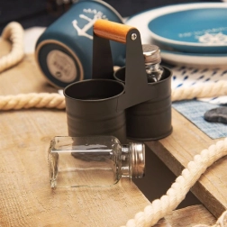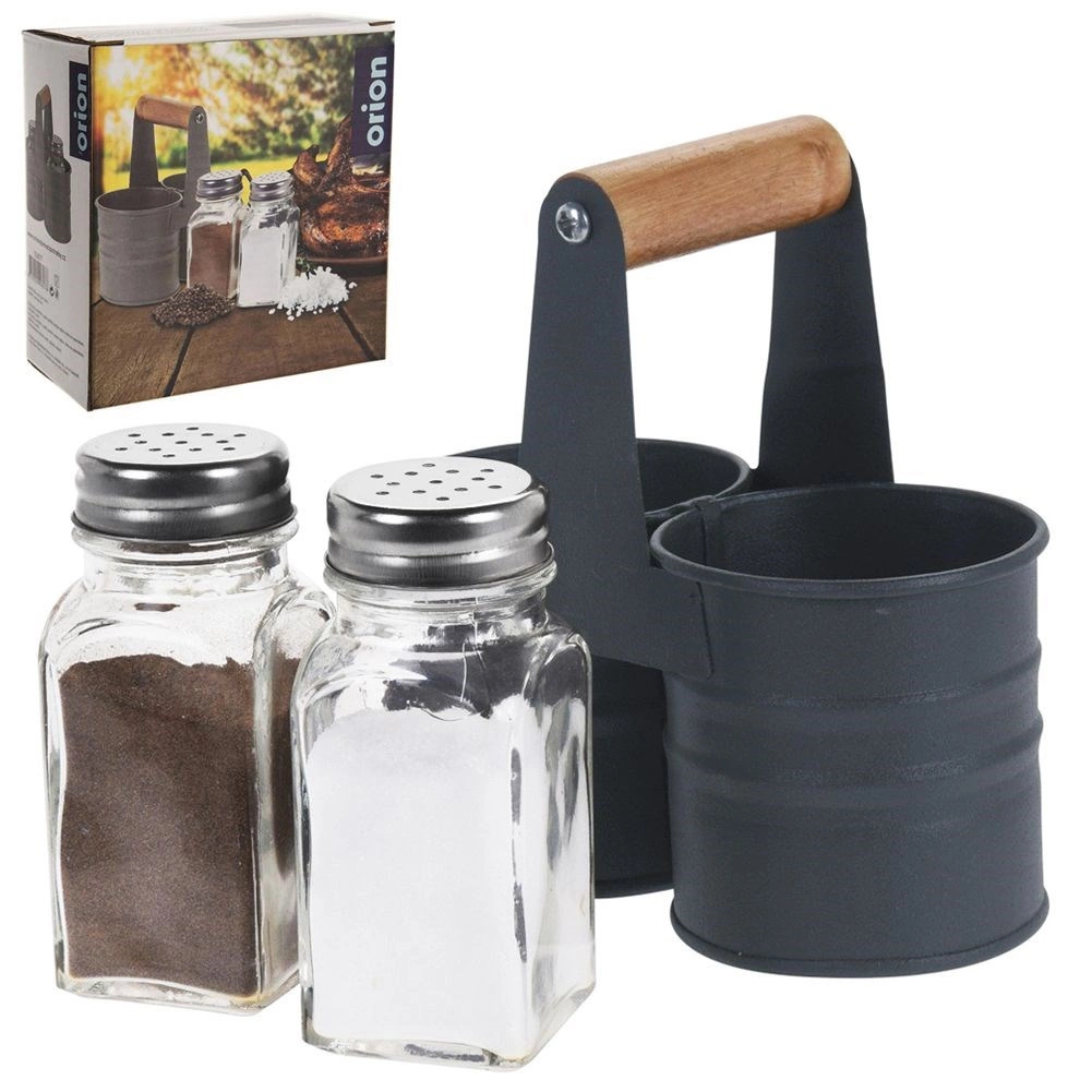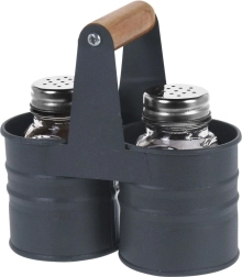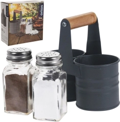 Elegante juego de salero y pimentero con frascos de vidrio en un práctico soporte metálico con mango de madera. Dimensiones compactas 13 × 6 × 12,5 cm, capacidad de cada frasco 75 ml. Dosificación cómoda gracias a las tapas perforadas de acero inoxidable, fácil limpieza y uso universal para el hogar y la gastronomía.