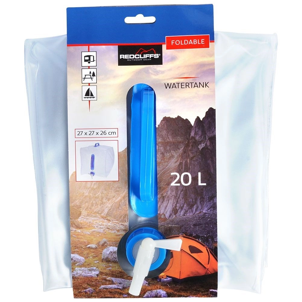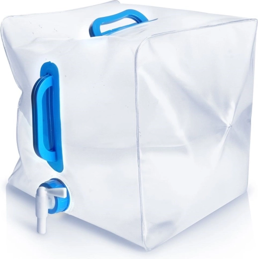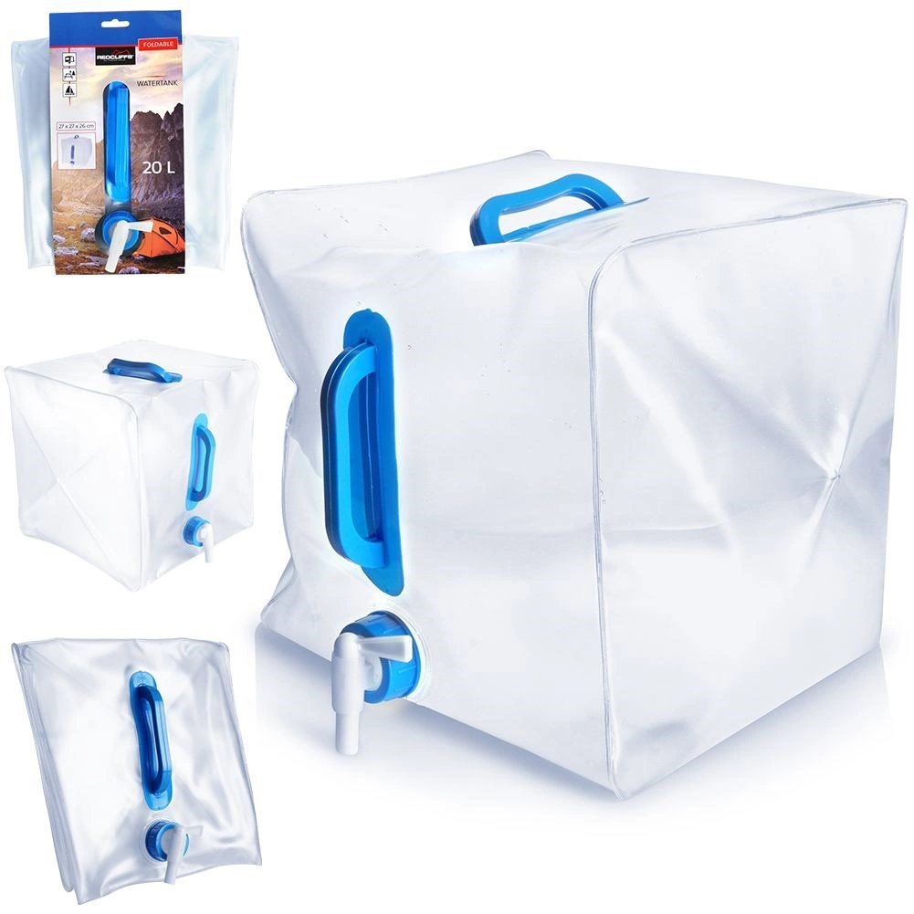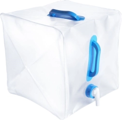 El bidón plegable para agua potable con capacidad de 20 litros está fabricado en plástico transparente de alta calidad, resistente y a la vez ligero. El grifo incorporado permite un vertido controlado sin derrames y las asas ergonómicas facilitan el transporte incluso cuando el depósito está lleno.