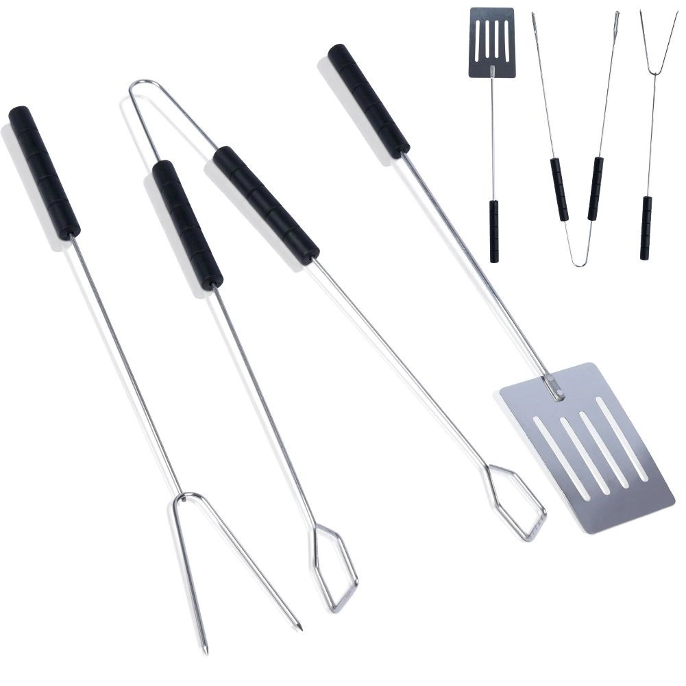 Práctico juego de utensilios para barbacoa de acero resistente que incluye espátula, pinzas y tenedor de 38 cm de largo. Gracias a los mangos largos te mantendrás a una distancia segura de la parrilla, los materiales duraderos garantizan una larga vida útil y los agarradores antideslizantes y cómodos facilitan la manipulación de los alimentos en casa y en el jardín.