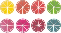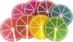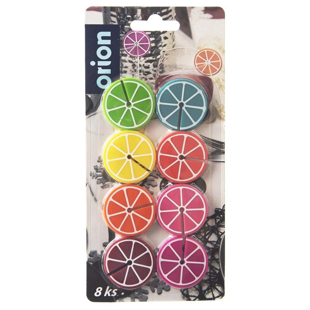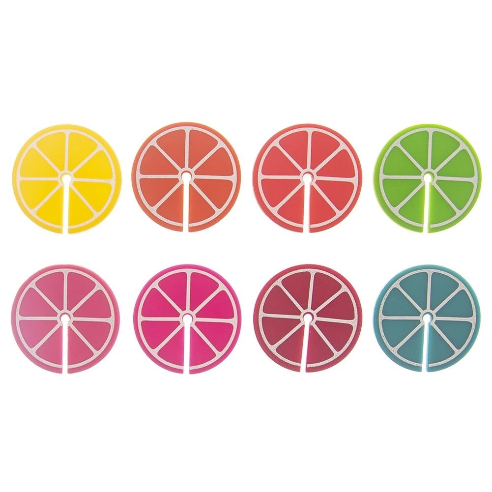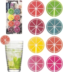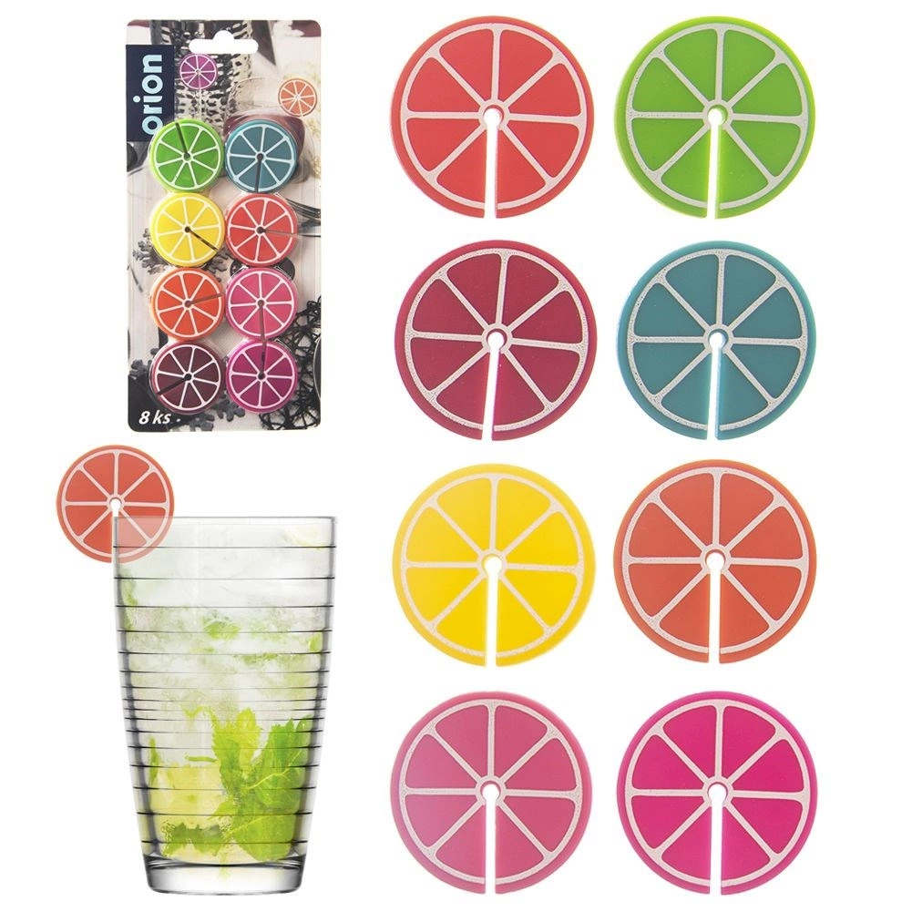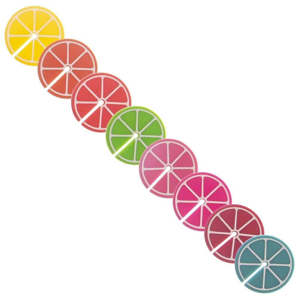 Práctico juego de 8 marcas de colores para copas y vasos con forma de rodajas de cítricos, de 3,7 cm de diámetro. Gracias a los diferentes colores, cada invitado reconocerá fácilmente su bebida. Fabricadas en silicona, aptas para uso repetido, ideales para fiestas y reuniones familiares.