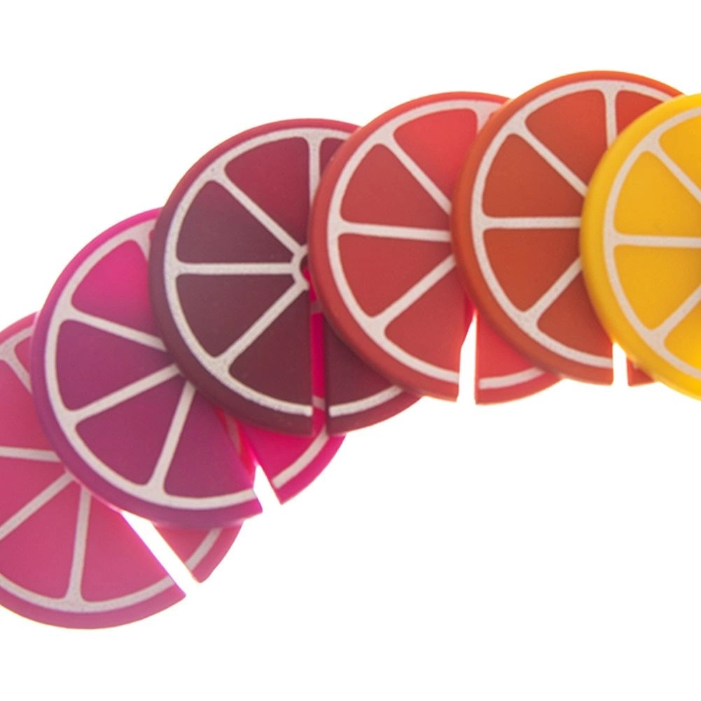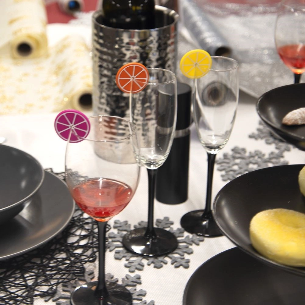 Marca copas y vasos de forma rápida y con estilo. Las marcas de silicona en forma de rodajitas de cítricos se fijan fácilmente al tallo de la copa o al borde superior del vaso. Están diferenciadas por colores, por lo que cada uno recordará su color y se evitarán confusiones de bebidas.