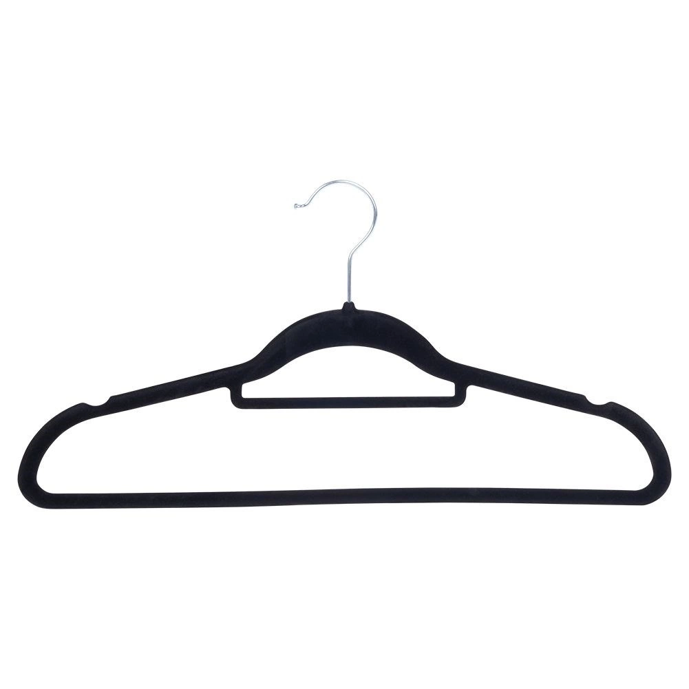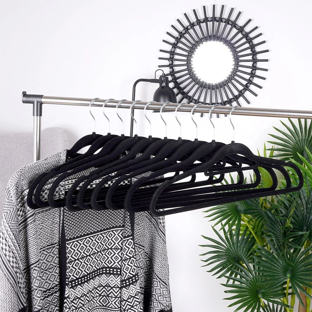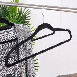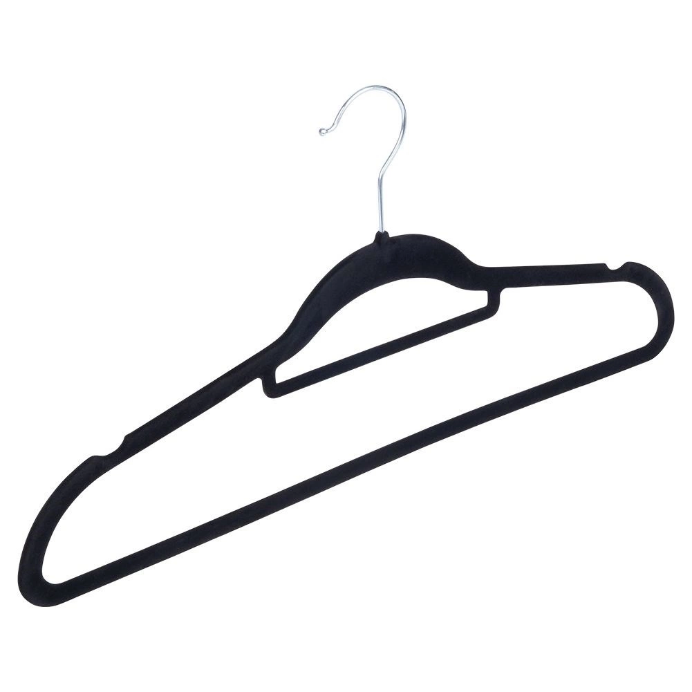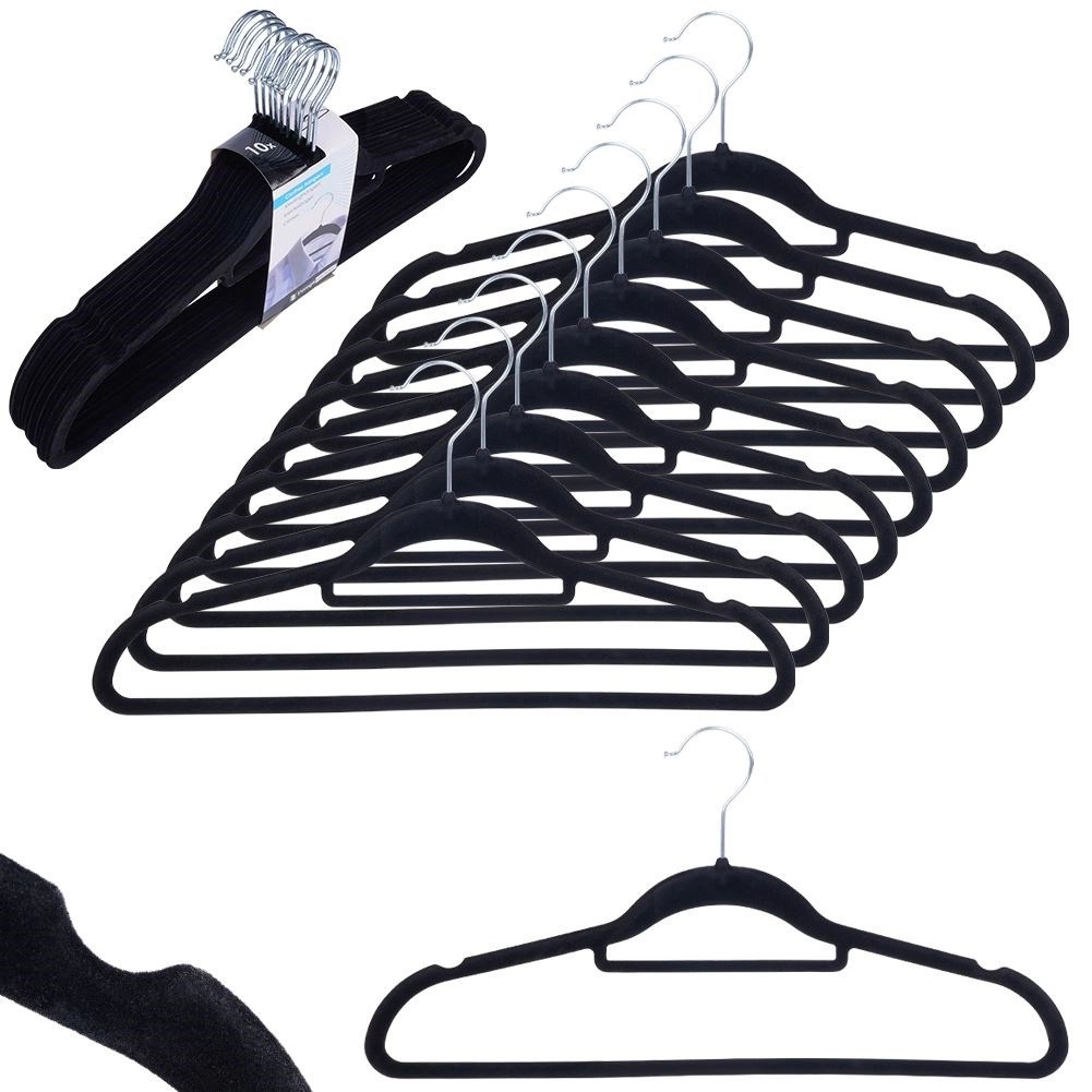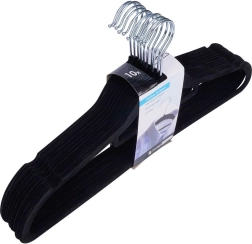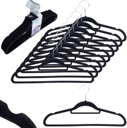 Práctico juego de 10 perchas delgadas con superficie de terciopelo suave que ayuda a mantener el armario ordenado y ahorrar espacio. El acabado antideslizante mantiene las prendas en su lugar con seguridad, mientras que el gancho metálico giratorio facilita colgarlas en cualquier dirección.