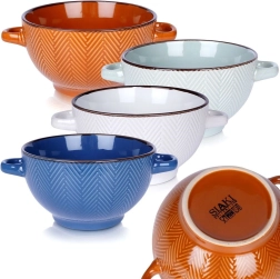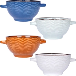 Los cuencos en colores armoniosos (blanco, azul, naranja/marrón claro y gris) presentan un elegante relieve de pez/chevron y un borde en contraste, lo que hace que luzcan perfectos en cualquier mesa. Son ideales no solo para sopas y cremas, sino también para cereales, yogur, fruta, ensaladas o snacks salados y dulces.