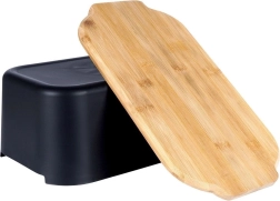 La panera moderna combina un cuerpo de plástico resistente en color negro mate con una tapa de bambú natural. La tapa se puede utilizar como tabla de cortar, así que siempre tendrás a mano todo lo necesario para servir el pan. Gracias a sus dimensiones compactas de 33 × 18,5 × 12 cm, cabe fácilmente en la encimera y a la vez admite distintos tipos de pan.