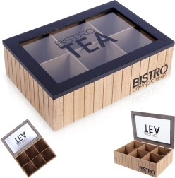 Elegante organizador de madera para bolsitas de té de estilo industrial con los rótulos BISTRO TEA y BISTRO COFFEE BAR, que cuenta con 6 compartimentos para clasificar los sabores de forma clara. Gracias a la tapa de vidrio con marco negro, podrás ver el contenido fácilmente sin abrir. La sólida estructura de MDF es resistente y duradera; la tapa abatible con dos bisagras garantiza un uso cómodo y ayuda a que los tés conserven el aroma y la frescura por más tiempo.
