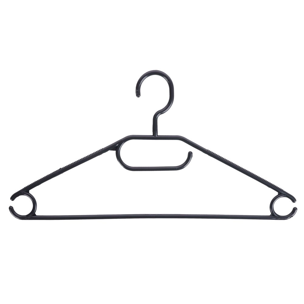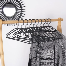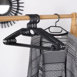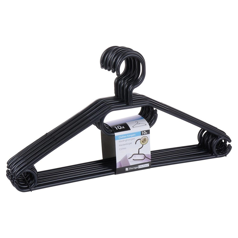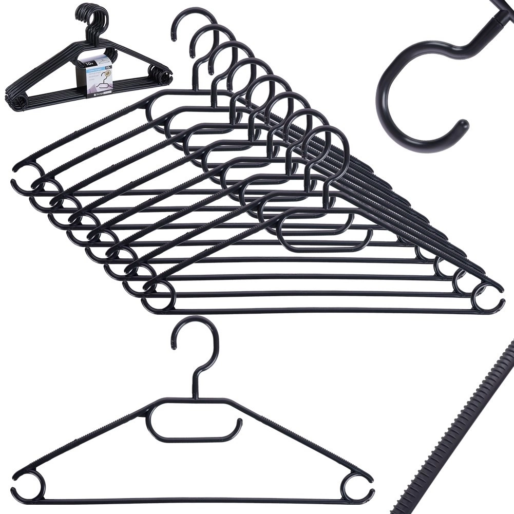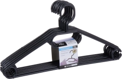 Mantén tu armario ordenado con un set de 10 perchas de calidad en elegante color negro. Gracias al gancho giratorio las colocarás fácilmente en cualquier armario, mientras que los múltiples puntos de colgado permiten colgar camisas, chaquetas, faldas, pantalones y accesorios como pañuelos o corbatas.