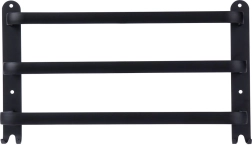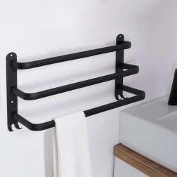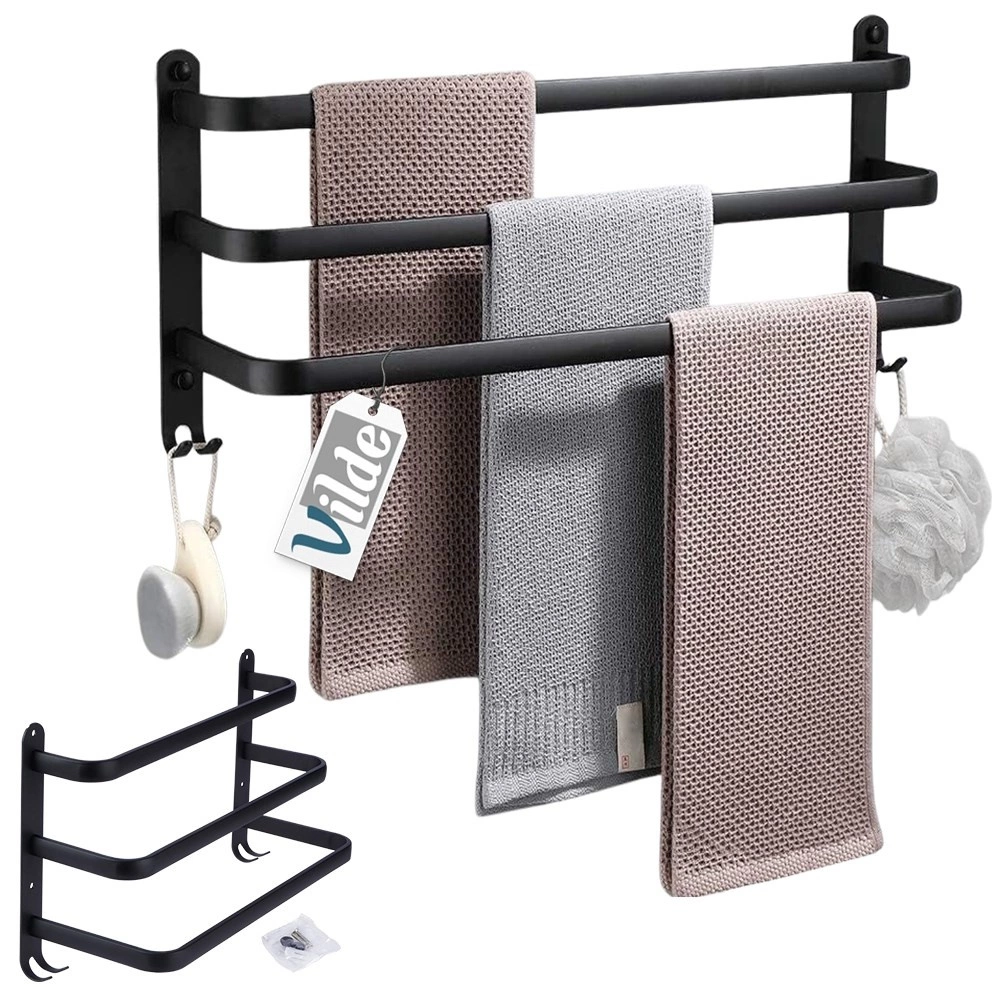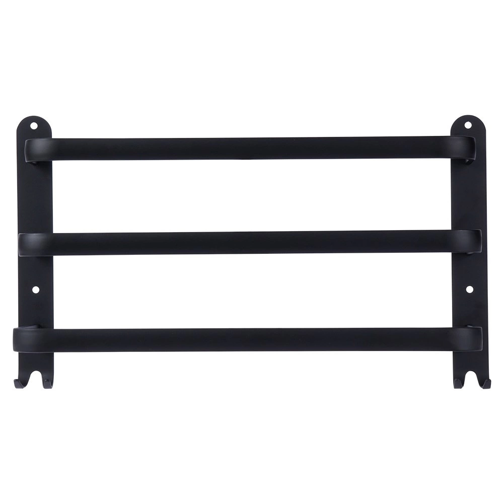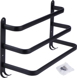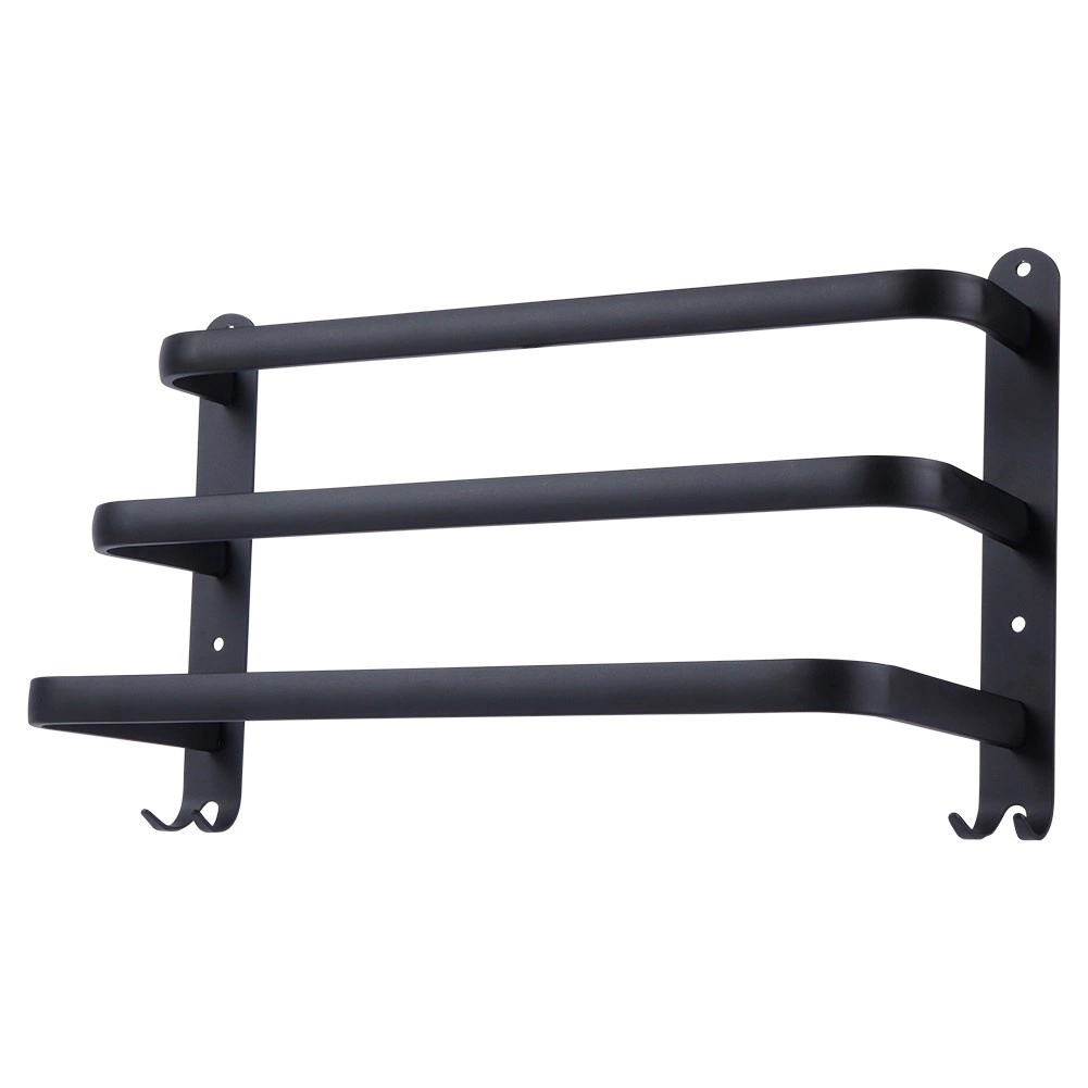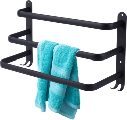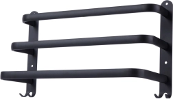 Un soporte para toallas estiloso y duradero para una organización clara de tu baño. Las tres barras horizontales permiten un secado y ventilación eficientes de las toallas, mientras que los cuatro ganchos en la parte inferior ofrecen espacio para manoplas o accesorios. El diseño minimalista en negro mate realza interiores de estilo escandinavo, moderno y tipo loft.