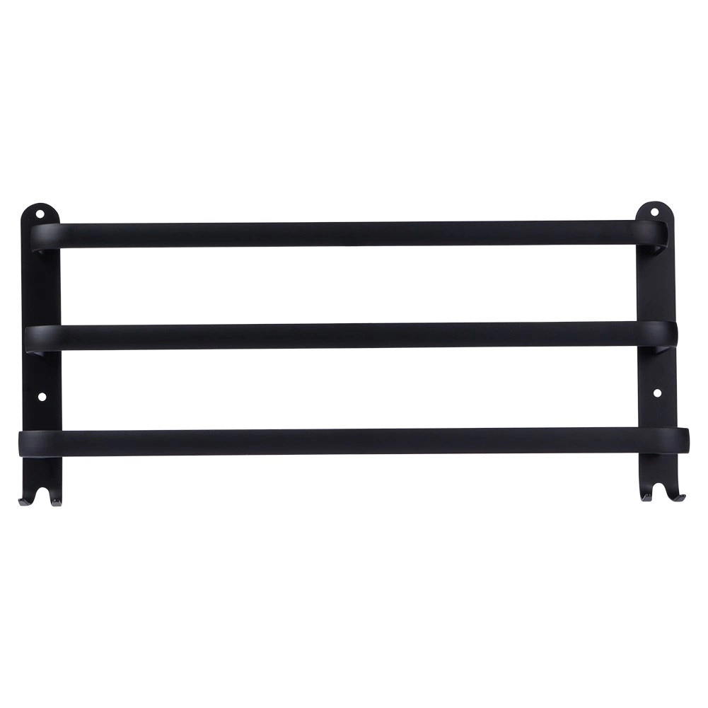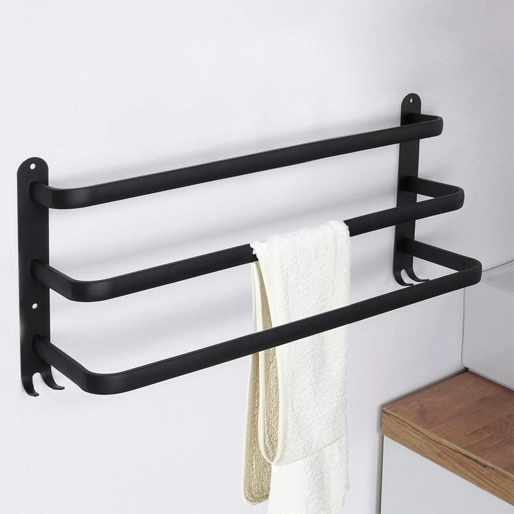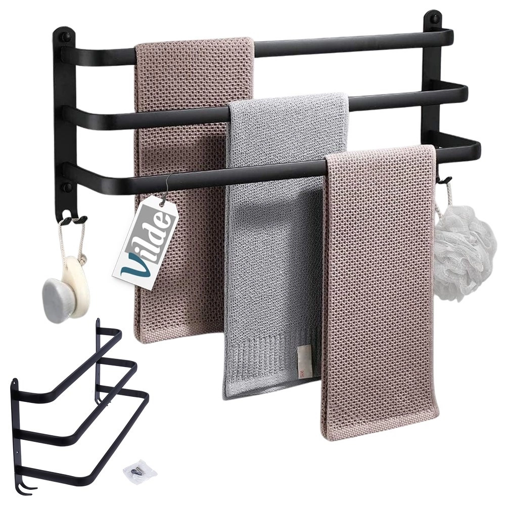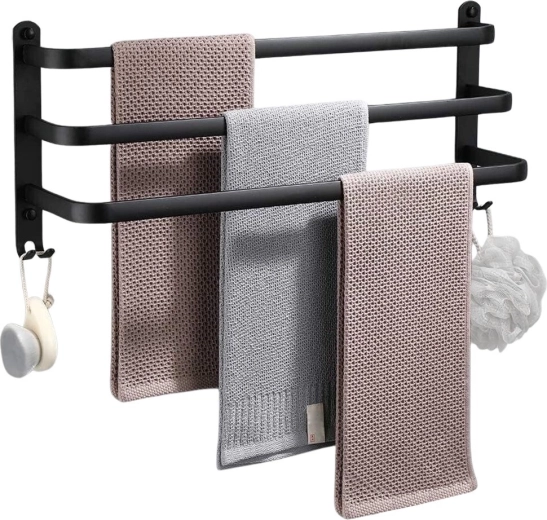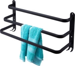 Maximiza el espacio de tu baño con este práctico toallero de 50 cm. La robusta estructura de aluminio con acabado negro mate es resistente a la humedad y, a la vez, elegante. Las tres barras independientes permiten una mejor circulación del aire y un secado más rápido, mientras que los cuatro ganchos inferiores ofrecen espacio para manoplas, esponjas o cepillos.