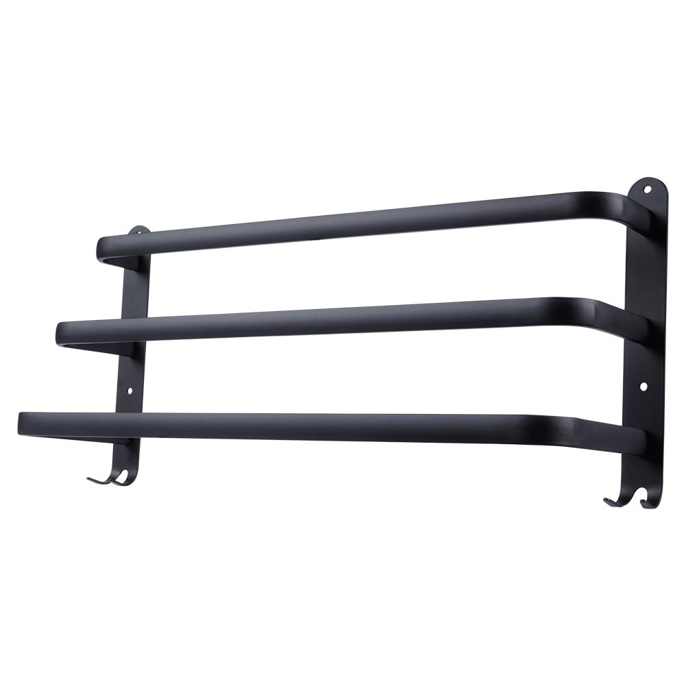 Elegante toallero de pared de aluminio resistente en color negro mate con tres barras para un secado eficiente y cuatro ganchos para accesorios. Gracias a su estilo industrial (loft), encaja a la perfección en baños modernos y clásicos, y su instalación sencilla con adhesivo, cinta 3M o tornillos garantiza un montaje rápido y firme.