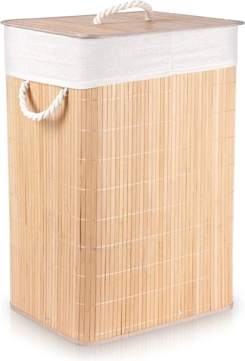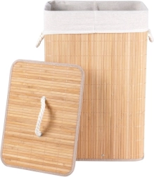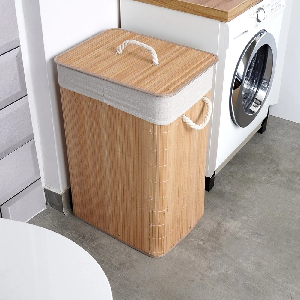 Elegante y espacioso cesto de ropa de bambú con una capacidad de 70 l y dos compartimentos para facilitar la clasificación. Cuenta con una estructura estable, tapa extraíble antiolores y forro de lino extraíble para una limpieza cómoda. Prácticas asas de cuerda para un transporte fácil. Un complemento ideal para el baño o la lavandería con estilo natural.