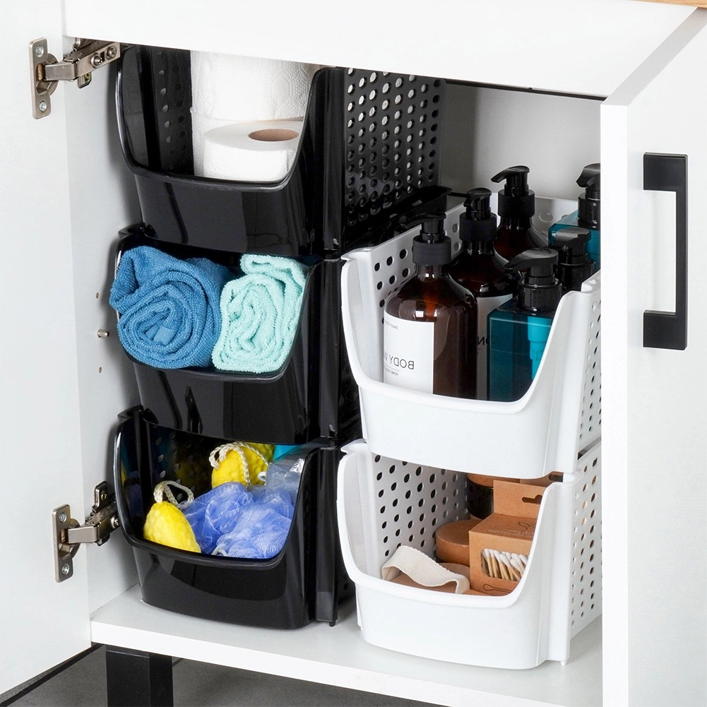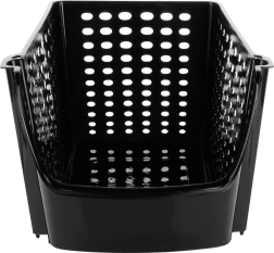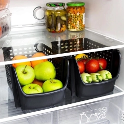 La cesta universal de plástico resistente sin BPA es ideal para la organización diaria de la cocina. Las paredes perforadas favorecen la circulación de aire, lo que ayuda a mantener las frutas y verduras frescas por más tiempo. La abertura frontal permite introducir y sacar el contenido rápidamente, ya sea que la cesta esté sobre la encimera o colocada en un estante.