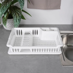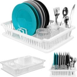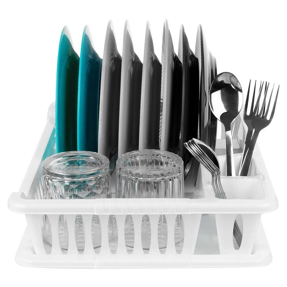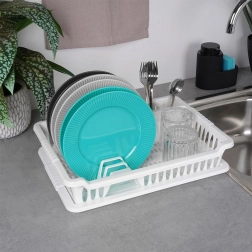 Práctico escurridor de platos blanco de 40 × 29 × 8,5 cm que facilita el secado de platos, vasos y cubiertos, a la vez que protege la encimera de la cocina. Cuenta con bandeja de goteo extraíble, espacio para 8 platos, compartimentos para cubiertos y zona para tazas. Es fácil de limpiar, libre de BPA y, gracias a su diseño clásico, encaja perfectamente en cocinas modernas y tradicionales.