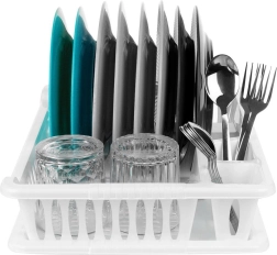 Las ranuras para platos, dos compartimentos para cubiertos y el espacio para tazas o vasos garantizan un secado ordenado y una circulación de aire eficiente.