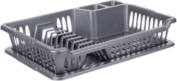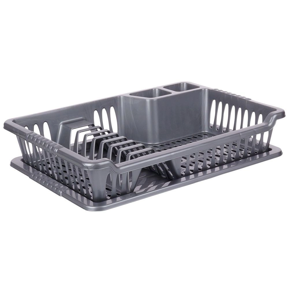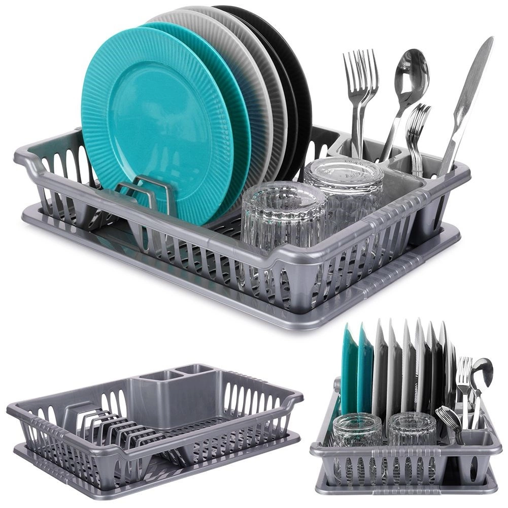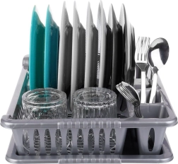 Práctico escurreplatos gris de 40 × 29 × 8,5 cm que mantiene la encimera seca y la vajilla bien organizada. Incluye una bandeja de goteo extraíble, espacios para platos, tazas y cubiertos, y está fabricado en plástico de alta calidad sin BPA. Ideal para el uso diario, fácil de limpiar y adecuado para cocinas modernas y clásicas. Sin BPA, bandeja extraíble, espacio para 8 platos, prácticos compartimentos para cubiertos.