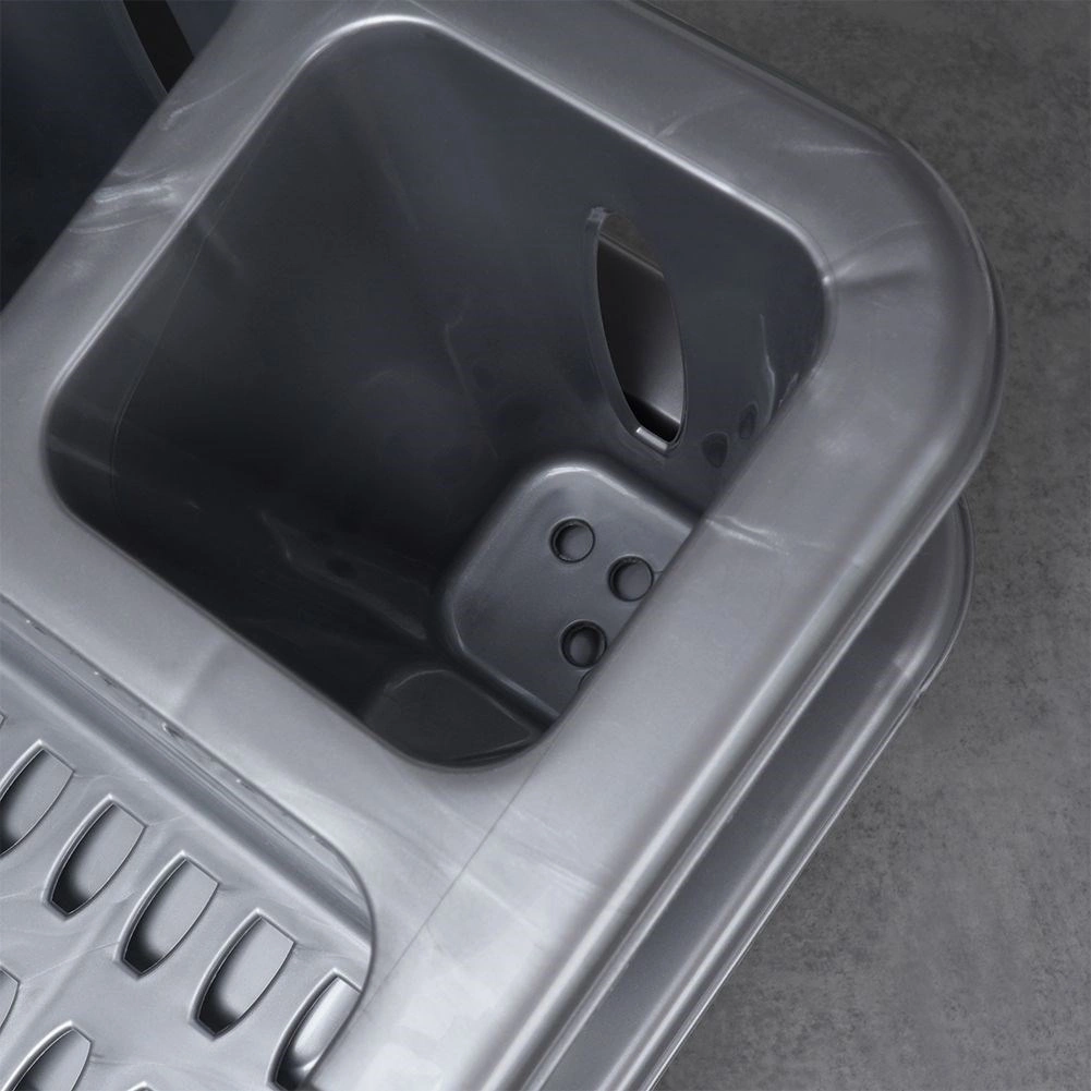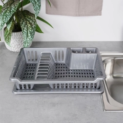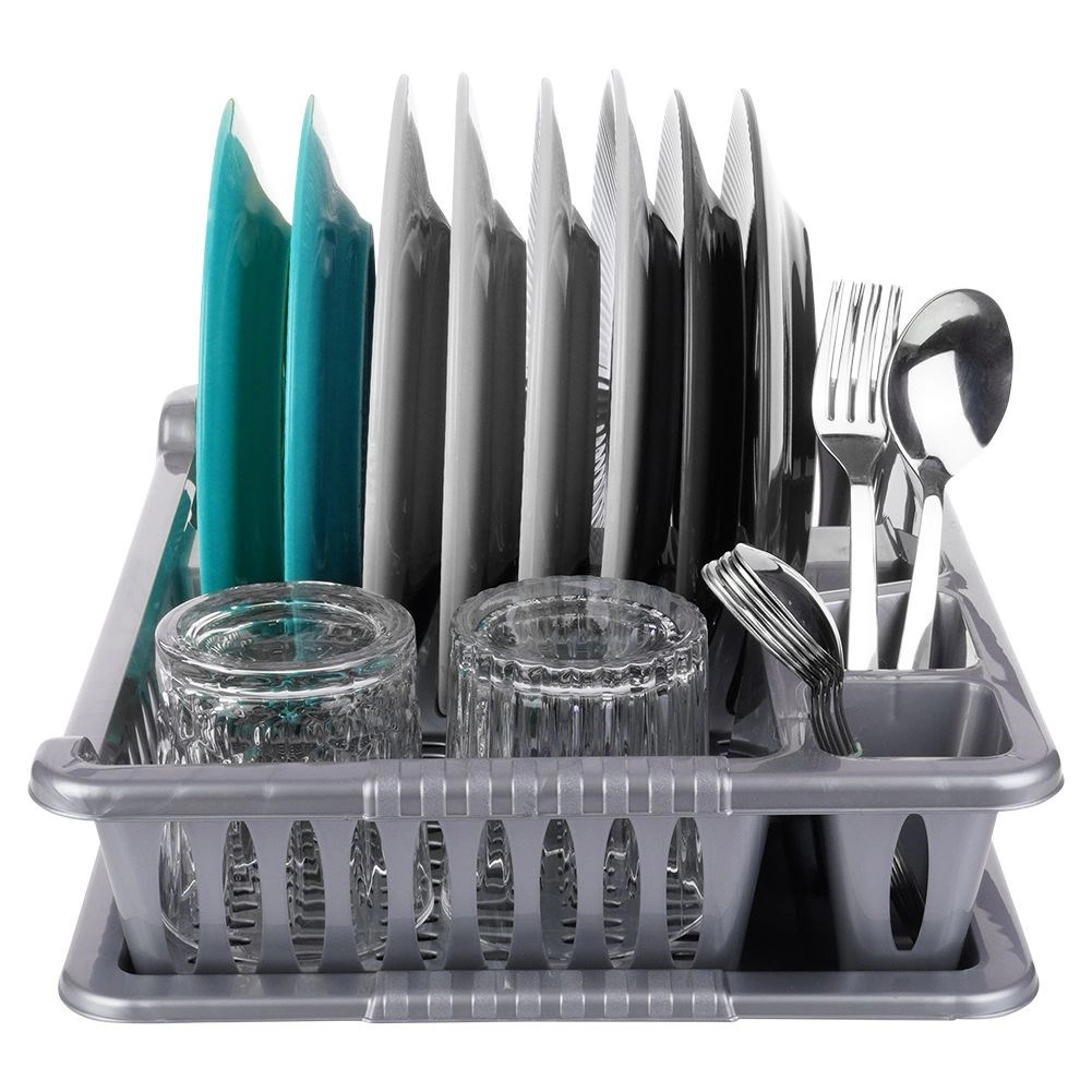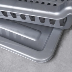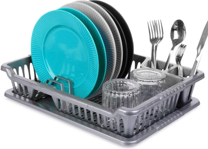 El escurreplatos está fabricado en plástico resistente sin BPA, es ligero, fácil de trasladar y sencillo de mantener limpio. Su color gris universal y diseño limpio encajan en cualquier cocina, desde la moderna hasta la clásica.