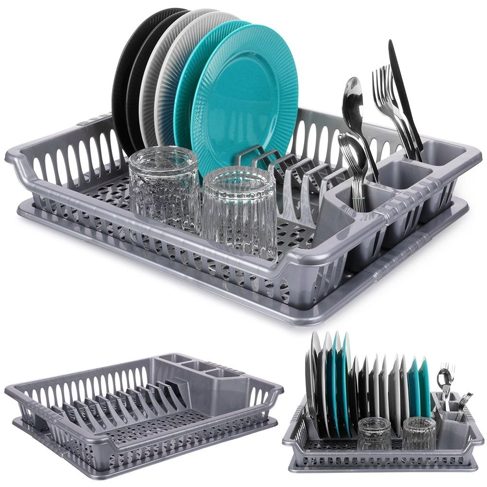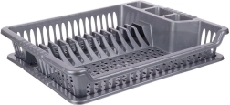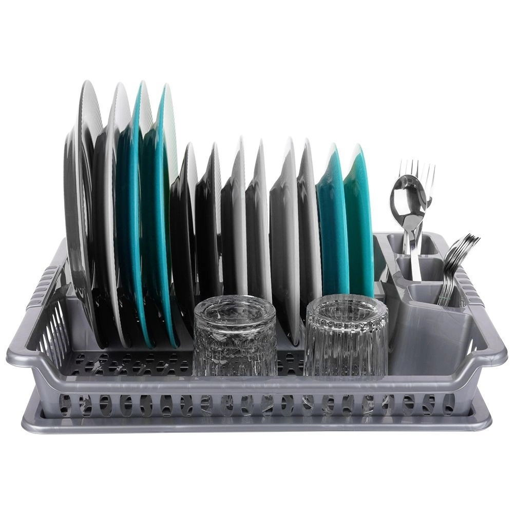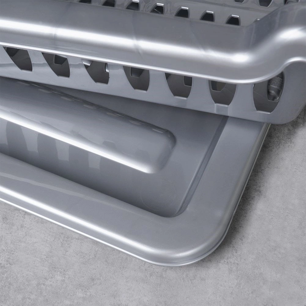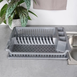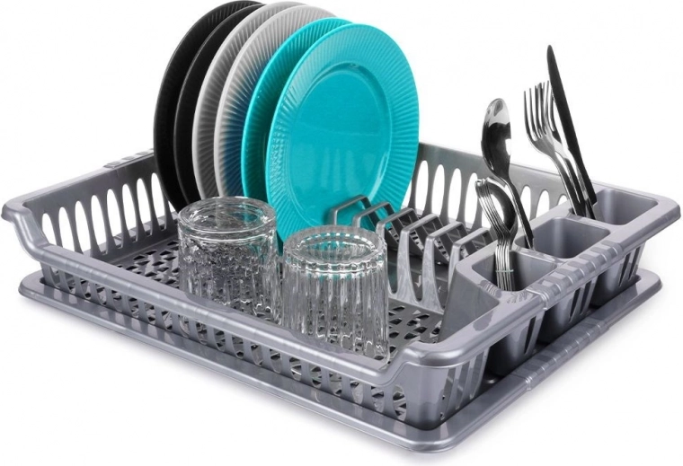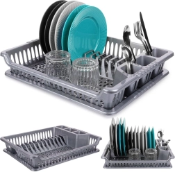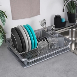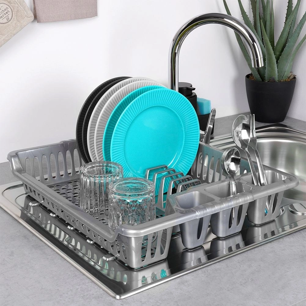 Práctico escurreplatos gris de 46 × 37 × 8,5 cm que facilita el lavado diario. Dispone de ranuras para platos, espacio para tazas y tres compartimentos para cubiertos. Gracias a la bandeja de goteo extraíble, la encimera se mantiene seca y el mantenimiento es sencillo. Fabricado en plástico resistente sin BPA, una solución ligera y estable para cocinas modernas y clásicas.
