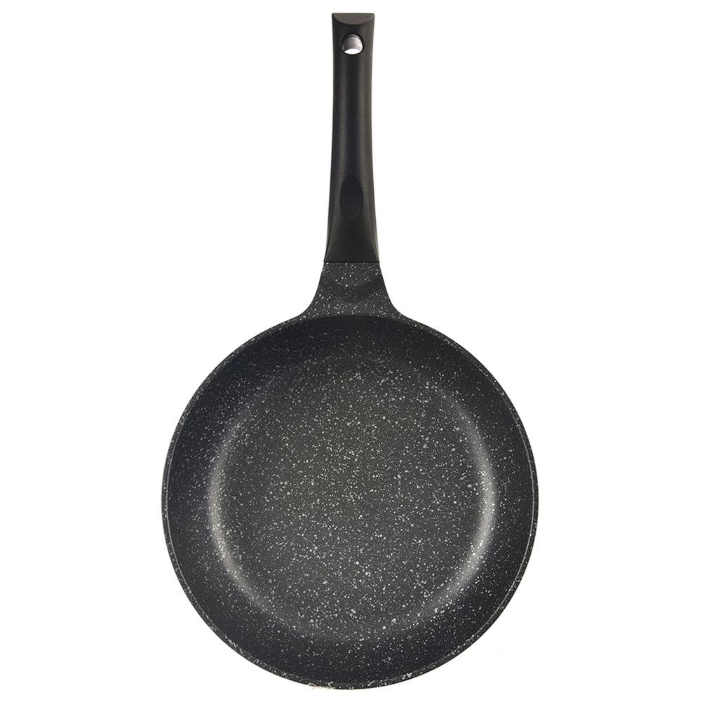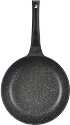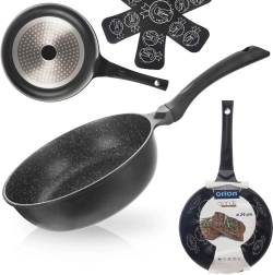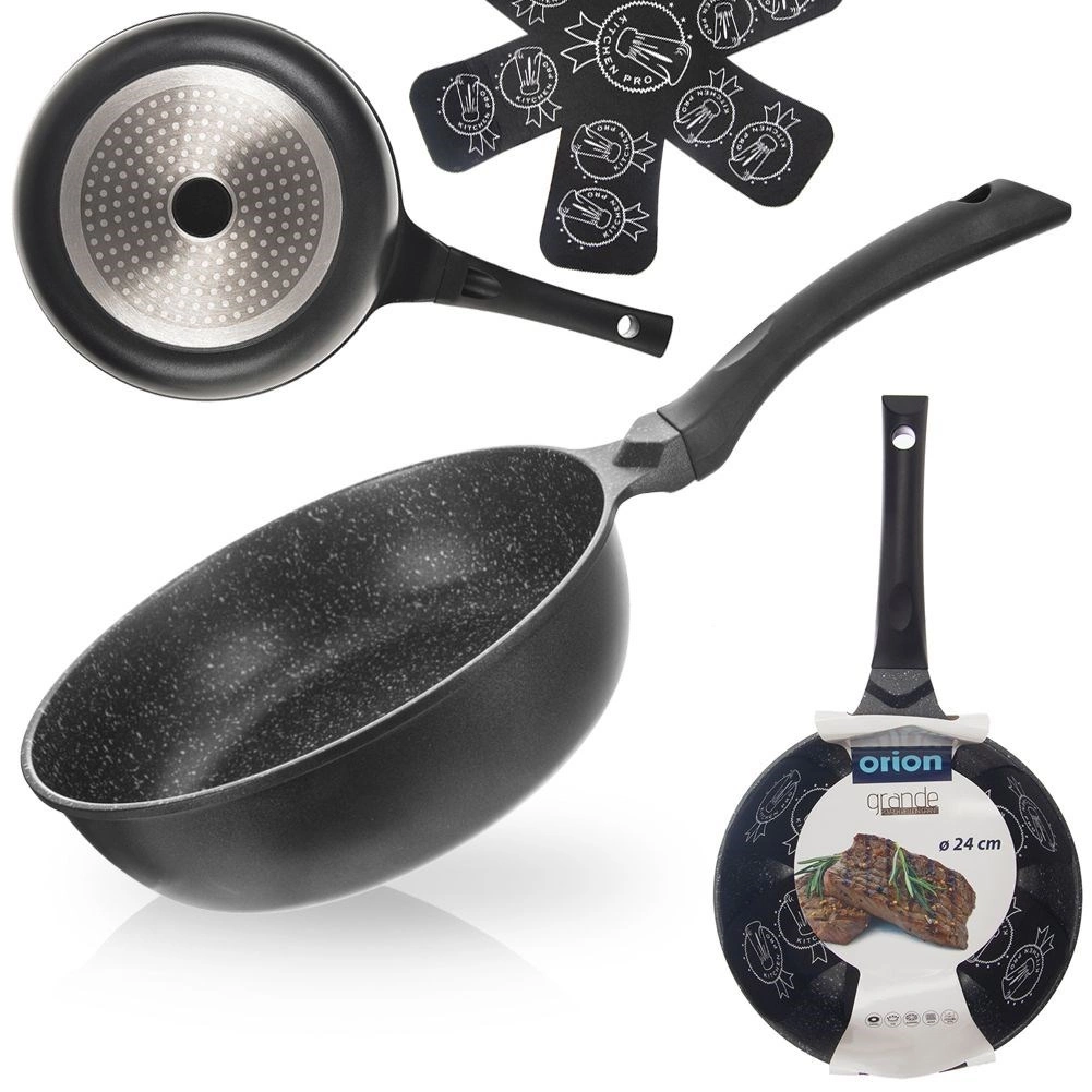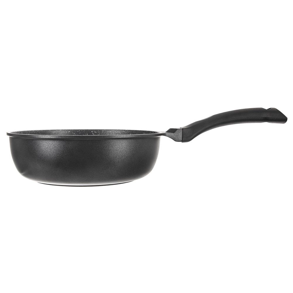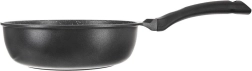 Sartén profunda antiadherente de 24 cm de diámetro, fabricada en resistente fundición de aluminio, que ofrece distribución del calor rápida y uniforme, superficie de granito antiadherente sin PFOA y uso universal en todo tipo de cocinas, incluida la inducción. Gracias a su borde alto, es ideal para freír y guisar, ahorra energía y permite cocinar con mínima cantidad de grasa. Incluye una almohadilla protectora de fieltro para un apilado seguro.