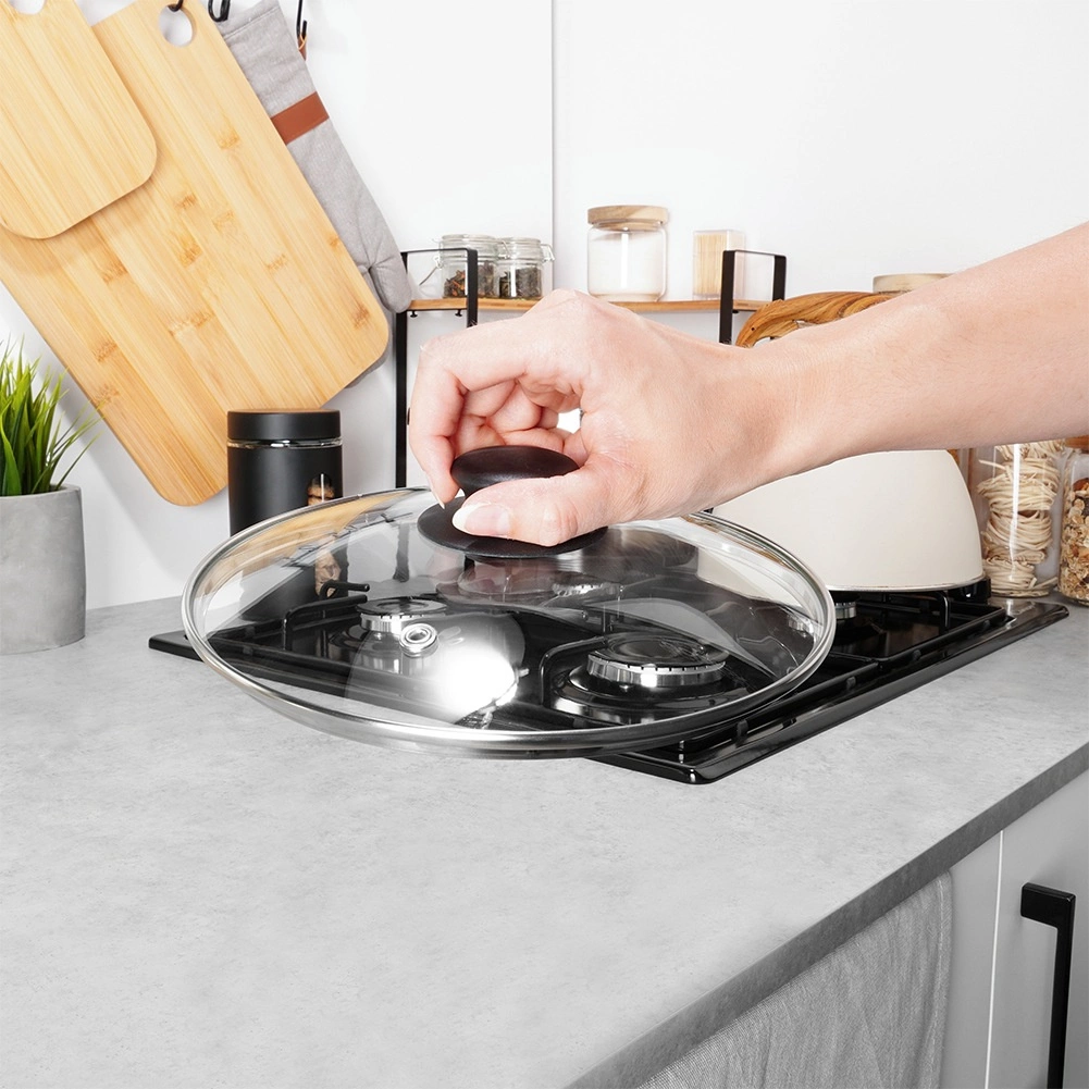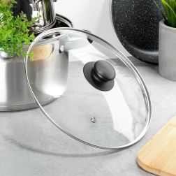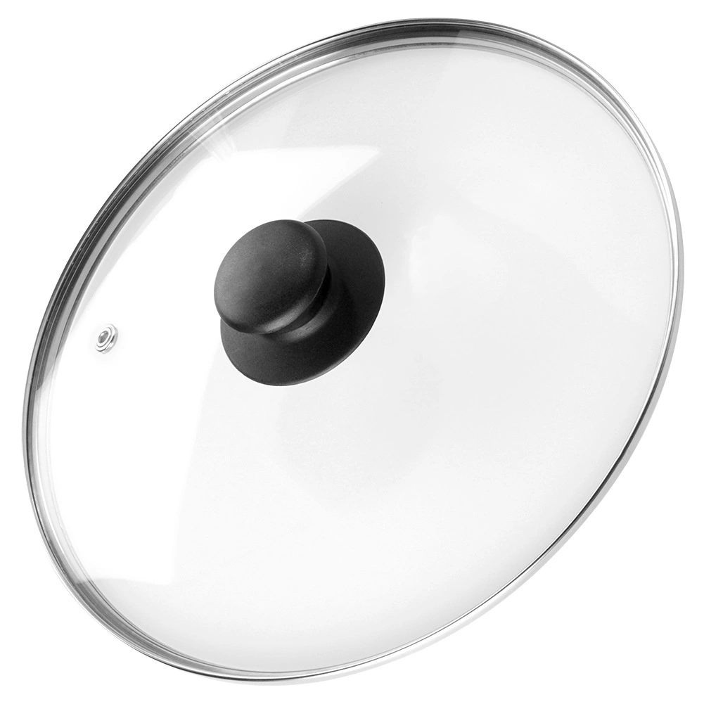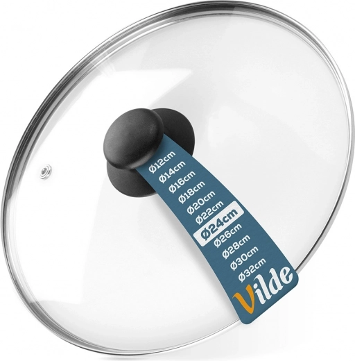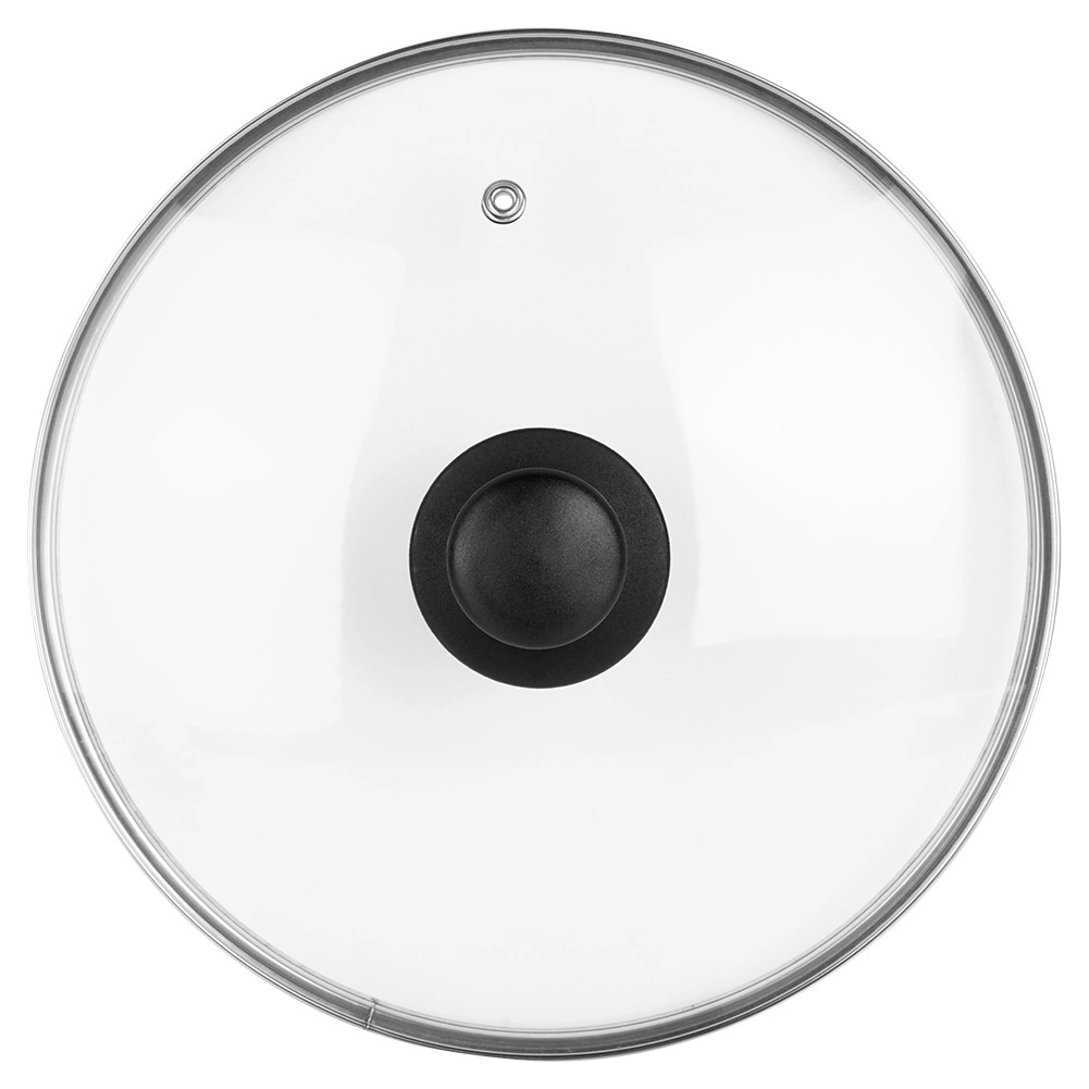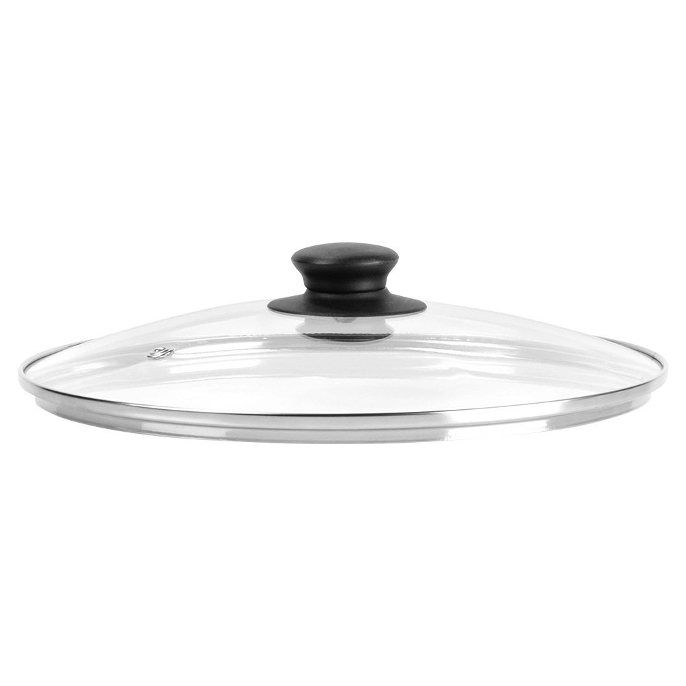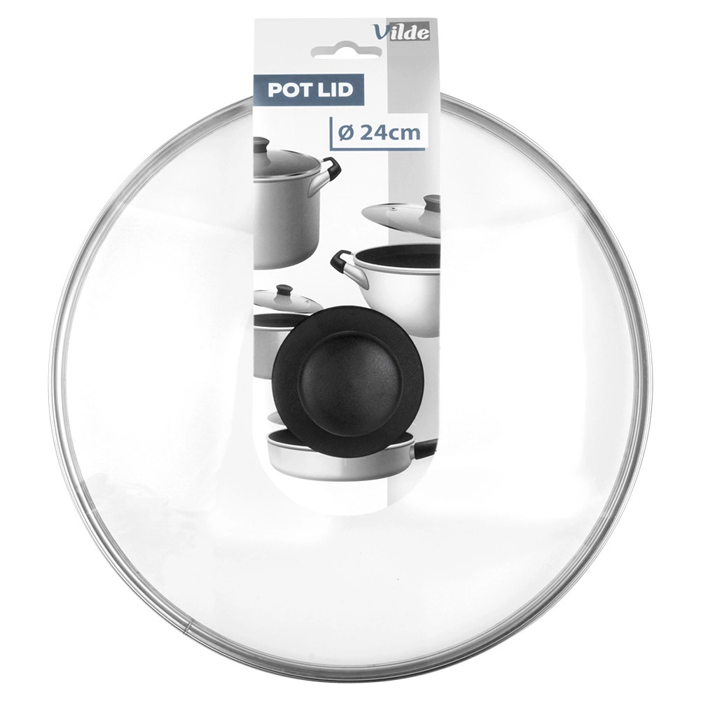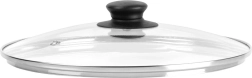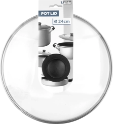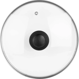 La práctica tapa de vidrio encaja en ollas, sartenes y cazos de 24 cm de diámetro. Está fabricada con vidrio transparente resistente al calor con borde de acero inoxidable en color plateado y asa de plástico resistente en color negro. Su forma ligeramente abombada favorece la circulación del aire caliente y acelera la preparación de los alimentos.
