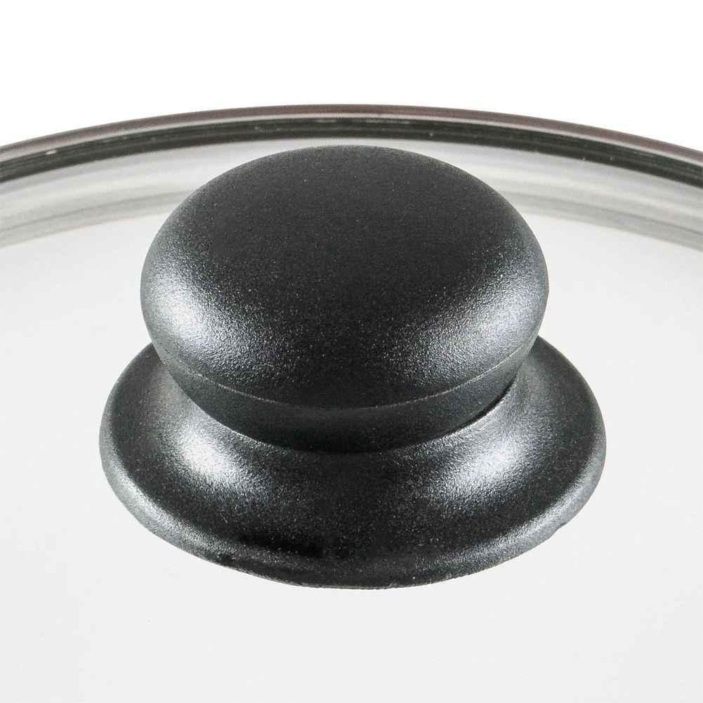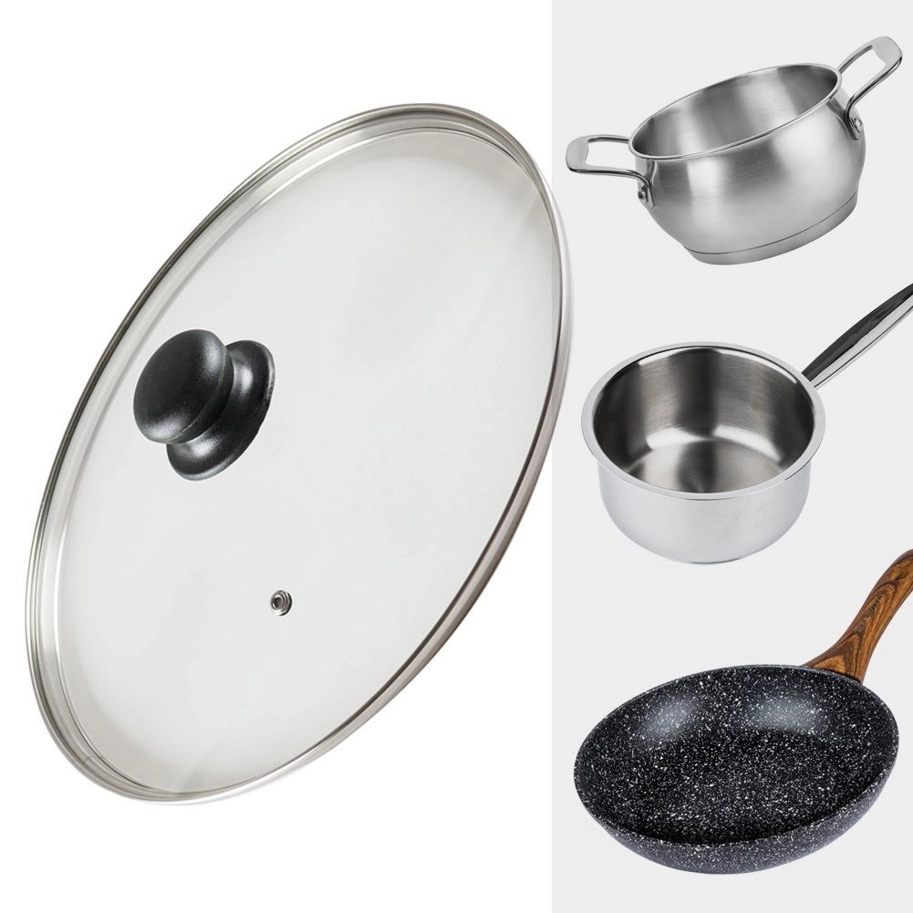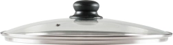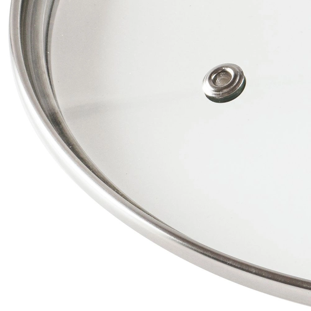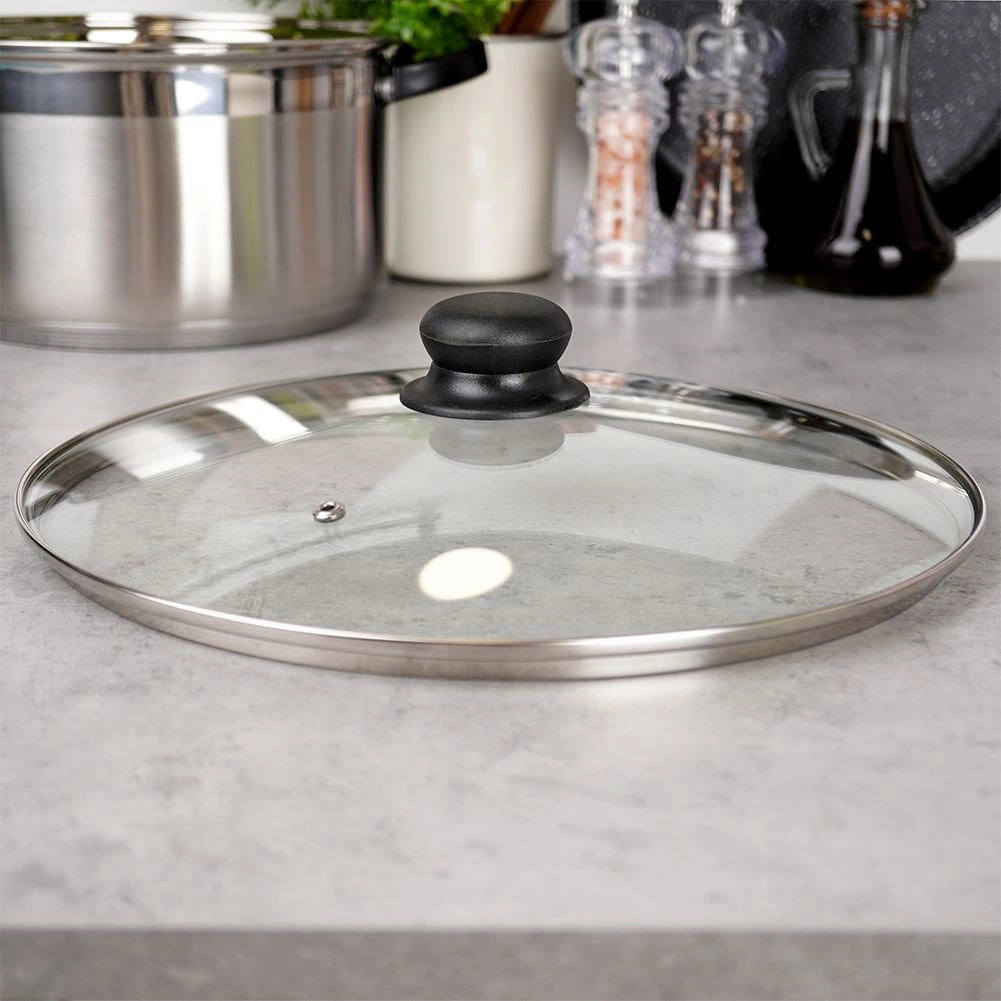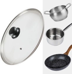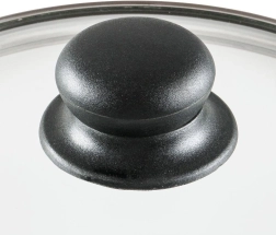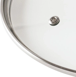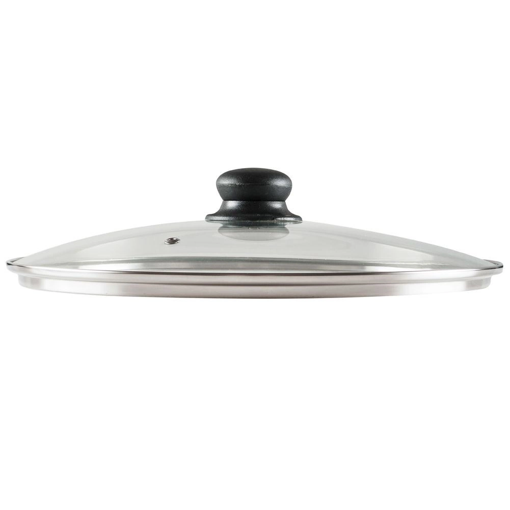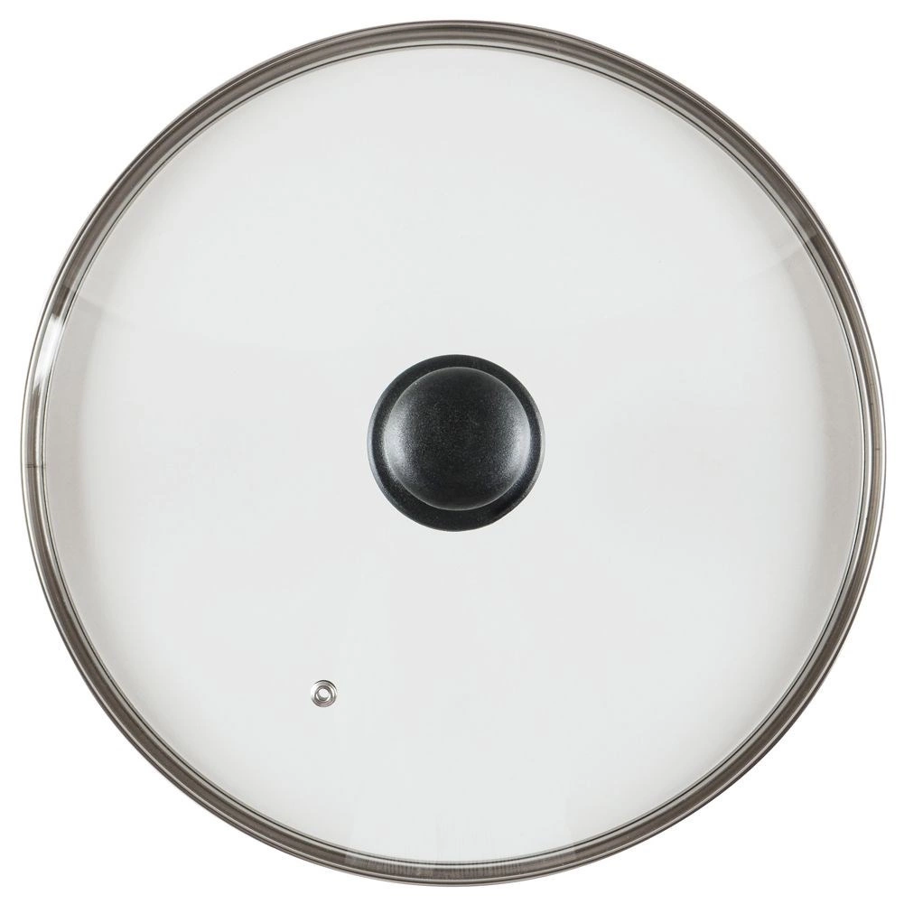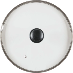 La tapa está fabricada en vidrio resistente al calor con borde de acero inoxidable en elegante color plateado y asa de plástico resistente en color negro. Es ligeramente abombada para una mejor circulación del aire caliente y está equipada con un orificio de ventilación para evacuar de forma segura el exceso de vapor. El borde alto garantiza un asentamiento firme y hermético sobre el borde del recipiente.