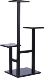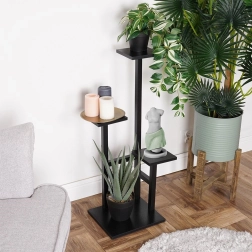 La construcción de metal negro lacado y estantes de MDF con superficie texturizada garantiza solidez y mantenimiento sencillo. Gracias a su alta estabilidad, puedes colocarlo en el salón, la cocina, el recibidor o el despacho. La base ofrece una superficie adicional para una maceta más grande.