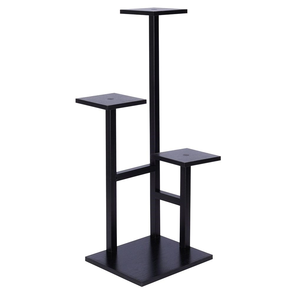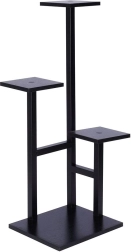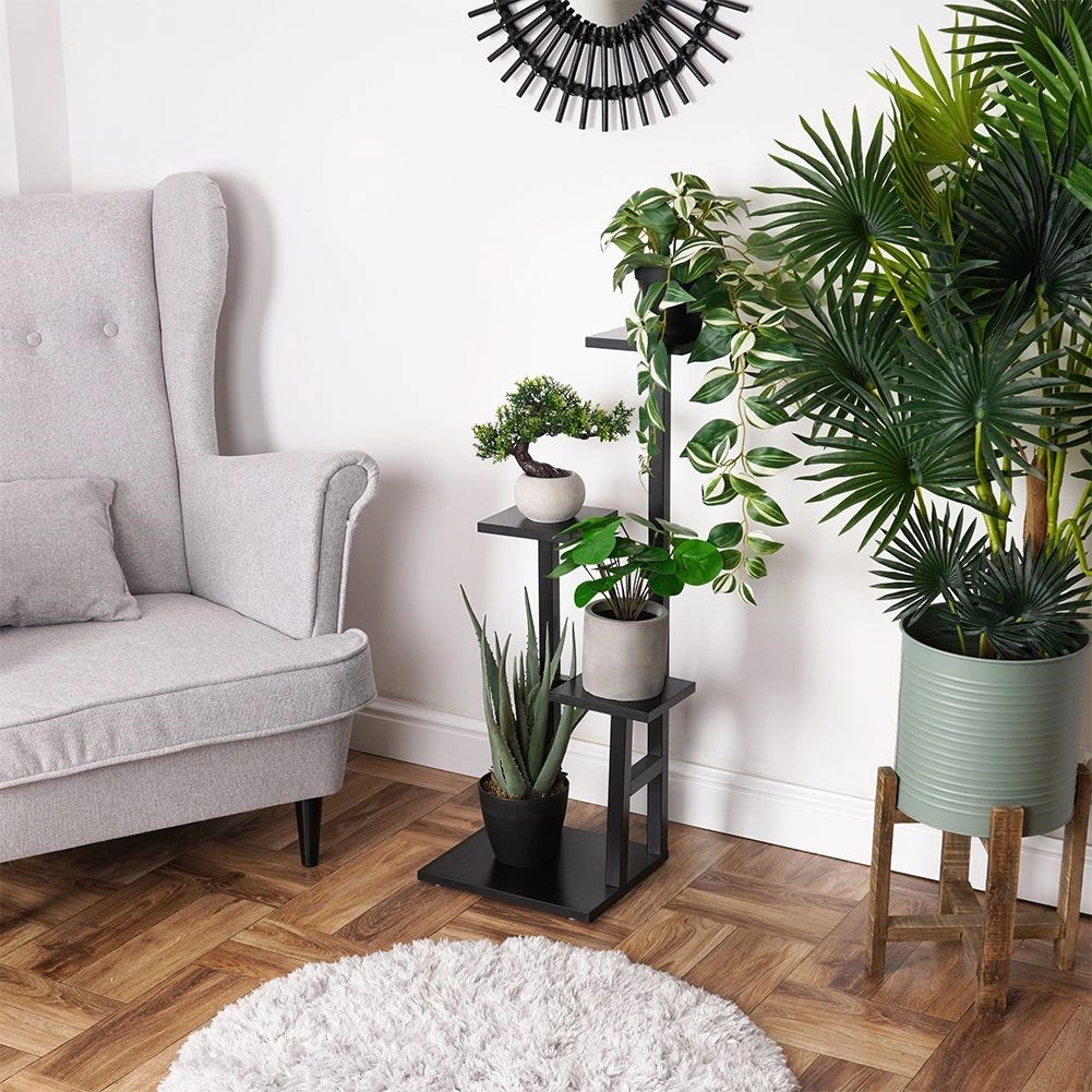 Elegante soporte para plantas de cuatro niveles con base compacta que ahorra espacio y exhibe claramente tus plantas y decoraciones. Sus dimensiones son 36,5 × 32 × 84 cm y soporta hasta 15 kg (máx. 5 kg por estante). La combinación de metal resistente y MDF con acabado efecto madera en color negro, su estructura estable y su estilo industrial encajan en el salón, la oficina e incluso en el balcón.