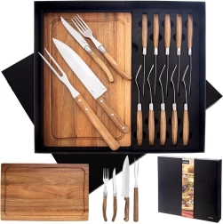 Incluye una tabla robusta de madera de acacia para cortar y servir. El set viene en una elegante caja de regalo, por lo que es una opción perfecta para obsequiar. Úselo en casa, en la parrilla y en entornos HoReCa.