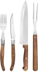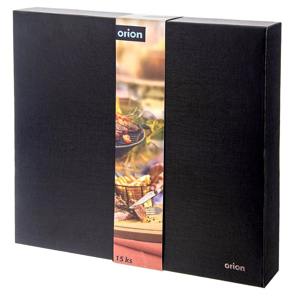 - 6× tenedor (22 cm), 6× cuchillo para bistec (23 cm, hoja 11 cm), 1× cuchillo de chef (33 cm, hoja 21 cm), 1× tenedor para carne (33 cm), 1× tabla (37 × 23 × 1,5 cm)
