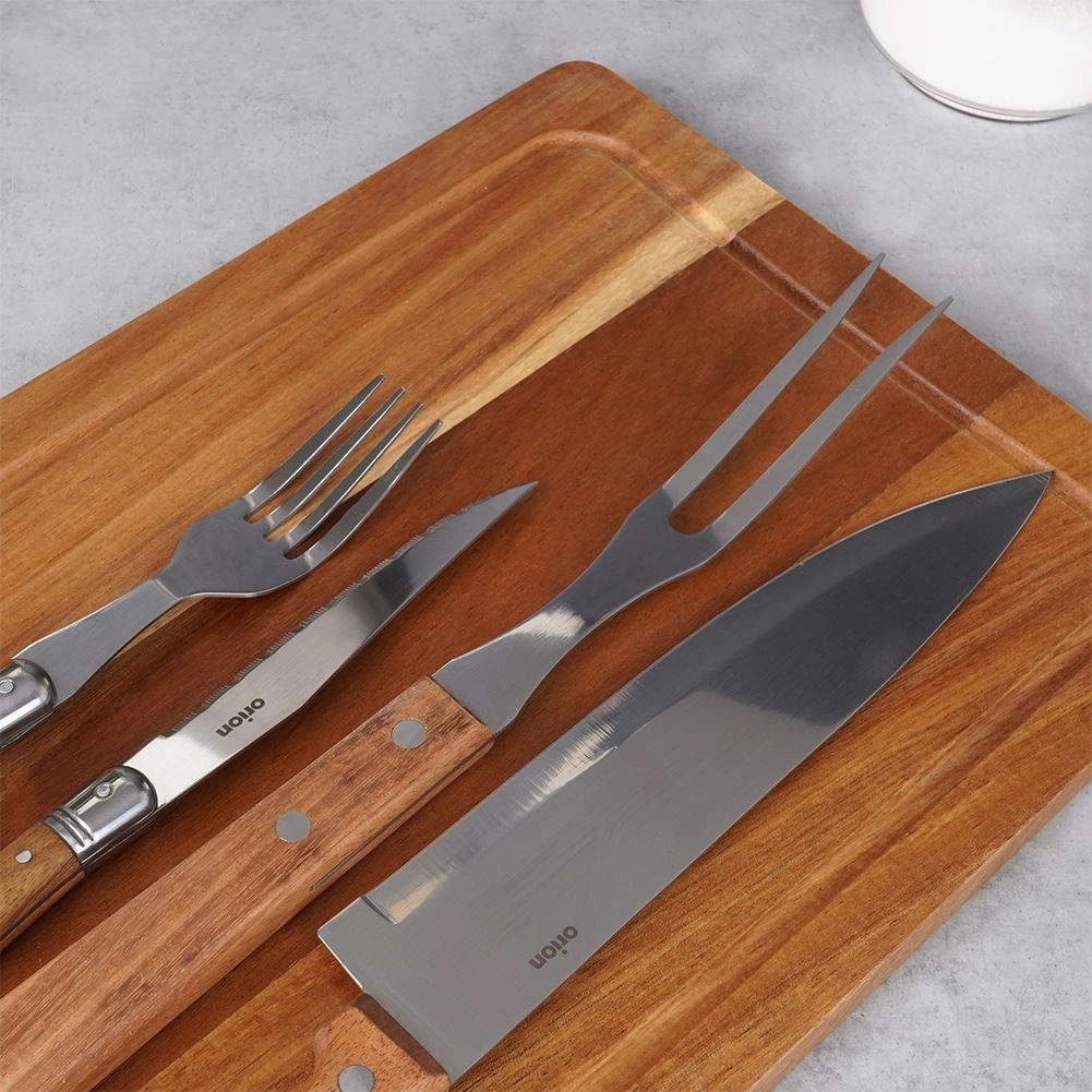 Este versátil juego combina corte preciso y servicio con estilo. Las hojas dentadas de acero inoxidable manejan bistecs, hamburguesas y pizza; el cuchillo de chef y el tenedor para carne facilitan el trinchado. Los mangos ergonómicos de madera de acacia con triple remache aseguran un agarre firme y cómodo.