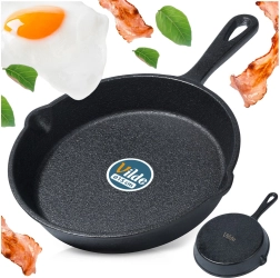 La sartén es completamente de hierro fundido, soporta altas temperaturas y es apta para la cocina, el horno y directamente para la parrilla o el fuego. Dos picos laterales facilitan el vertido de jugos o salsas; el mango cómodo con orificio permite colgarla. Para una larga vida útil, basta con un mantenimiento sencillo: enjuagar, secar bien y engrasar ligeramente.