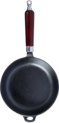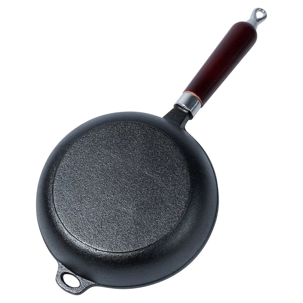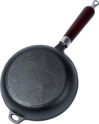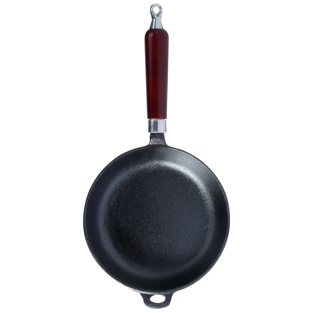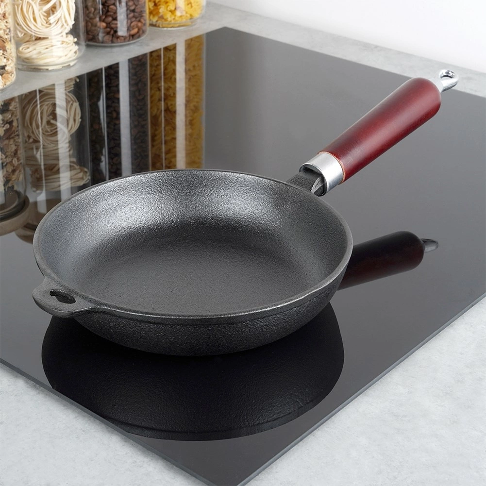 Sartén de hierro fundido de 20 cm universal para freír, asar y guisar en todo tipo de cocinas, incluida la de inducción, en la parrilla e incluso directamente sobre el fuego. El hierro fundido macizo acumula el calor de forma excelente, garantiza una cocción uniforme y mantiene los platos calientes durante más tiempo. Mango de madera ergonómico y asa auxiliar para una manipulación segura, con posibilidad de colgar. Sin recubrimientos químicos, extraordinariamente resistente y duradera con el mantenimiento adecuado.
