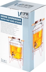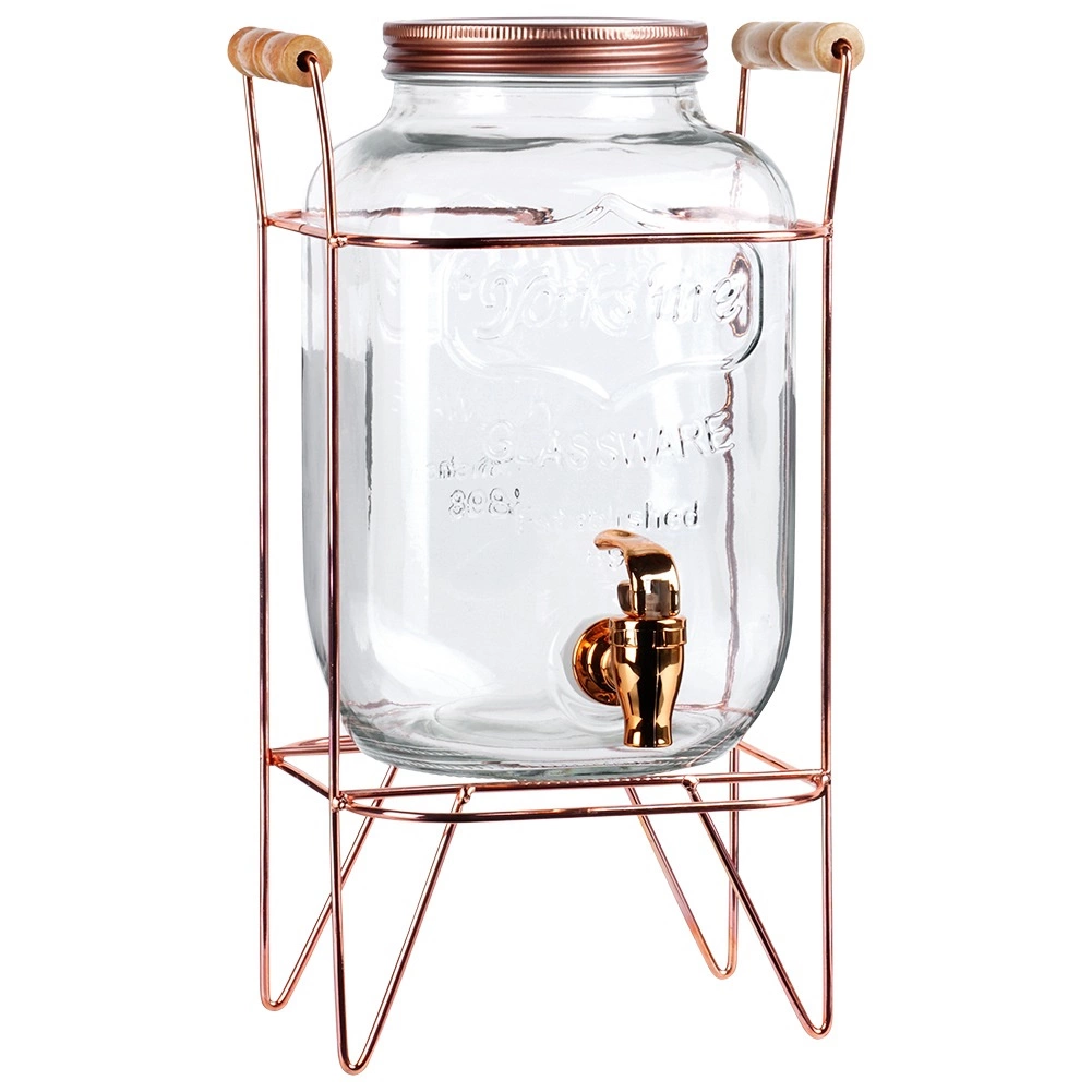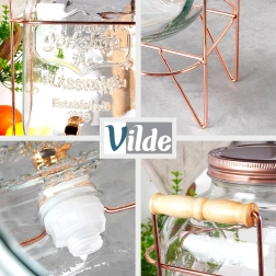Este dispensador con estilo combina vidrio grueso de alta calidad con un decorativo relieve embosado y un soporte metálico en tono oro rosa con asas de madera. La posición elevada del recipiente garantiza un vertido cómodo en los vasos sin tener que mover la bebida. La tapa metálica de rosca protege el contenido de la suciedad y los insectos, por lo que es perfecto tanto para exterior como interior.