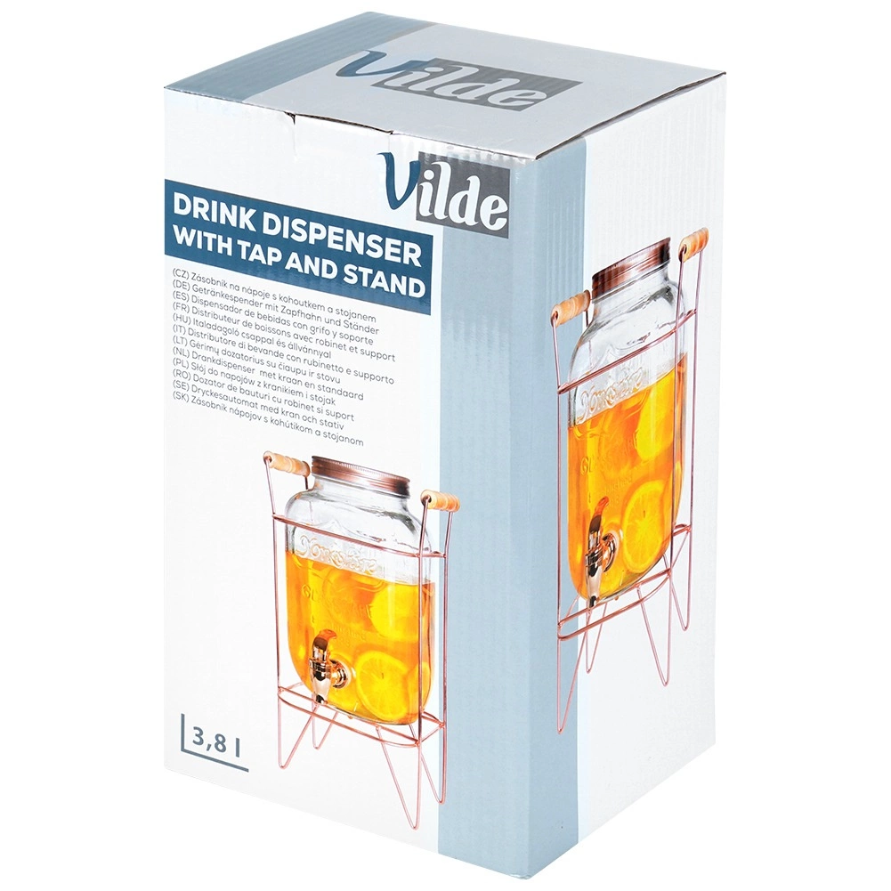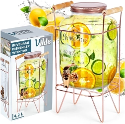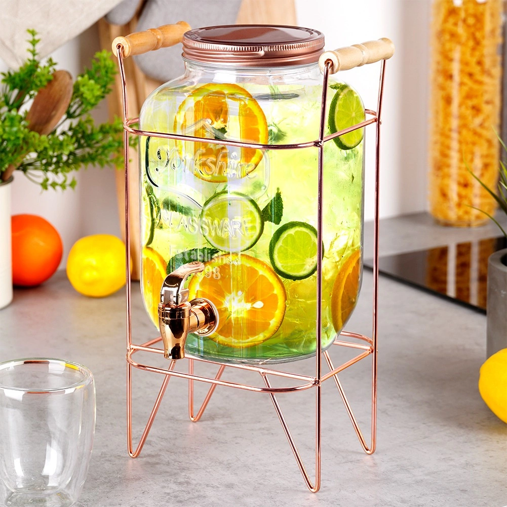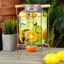 Elegante dispensador de bebidas de 4,2 l de vidrio con soporte estable en color oro rosa y práctico grifo para servir con facilidad. Ideal para limonadas, ponches, aguas saborizadas y tés helados durante fiestas, barbacoas y reuniones familiares. La boca ancha facilita añadir hielo y fruta, y la tapa de rosca protege la bebida de los insectos.