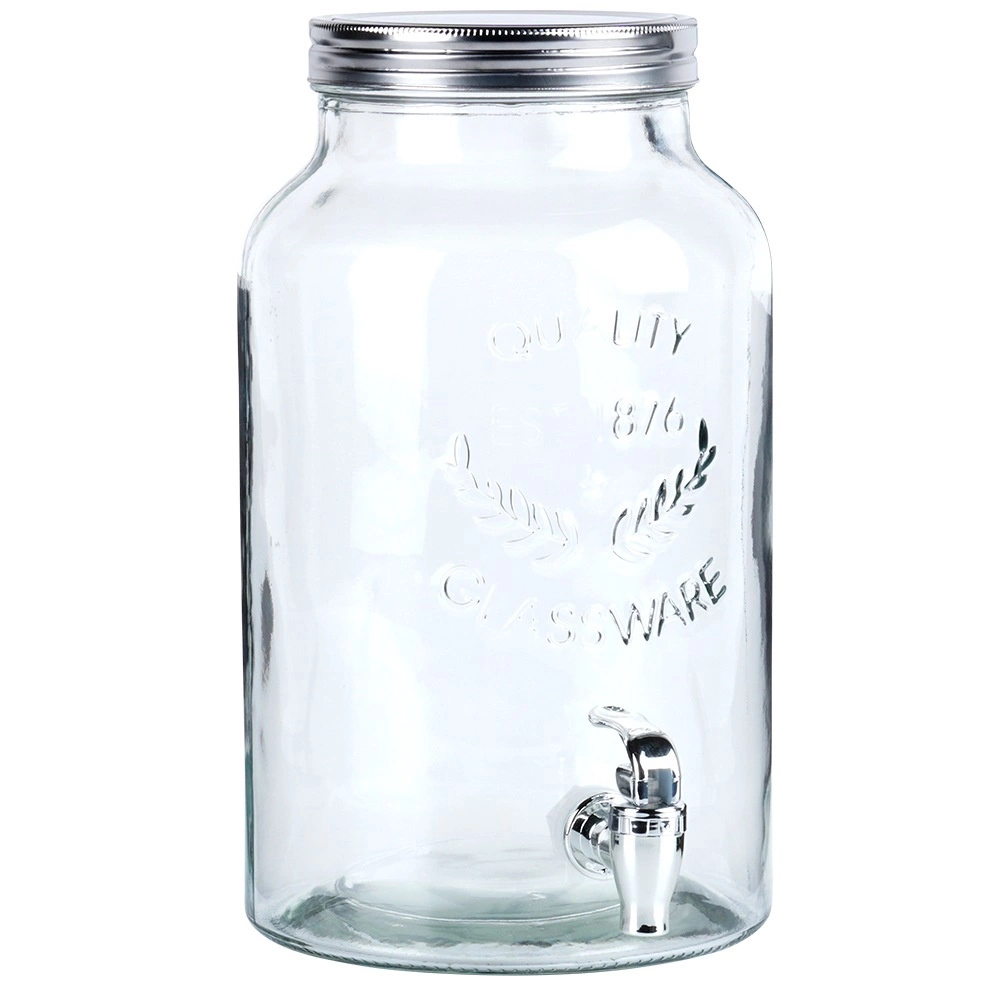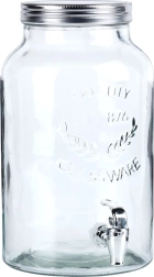 Elegante dispensador de bebidas de 6,2 l de vidrio con práctico grifo y tapa metálica de rosca. Ideal para limonadas, ponches, aguas saborizadas y tés helados. La boca ancha facilita el llenado y la limpieza, el vidrio con relieve aporta un toque elegante y los materiales son seguros para el contacto con alimentos.